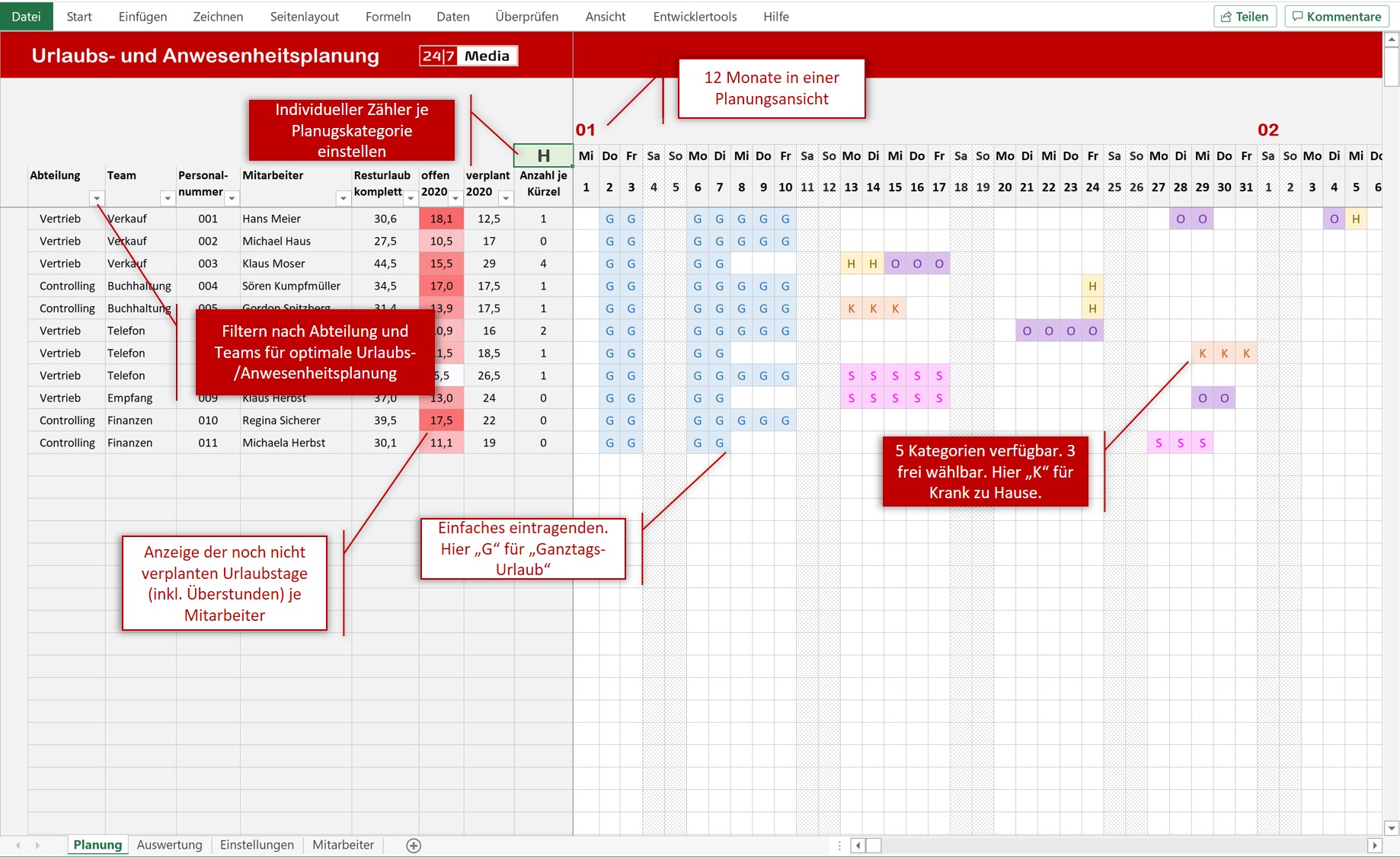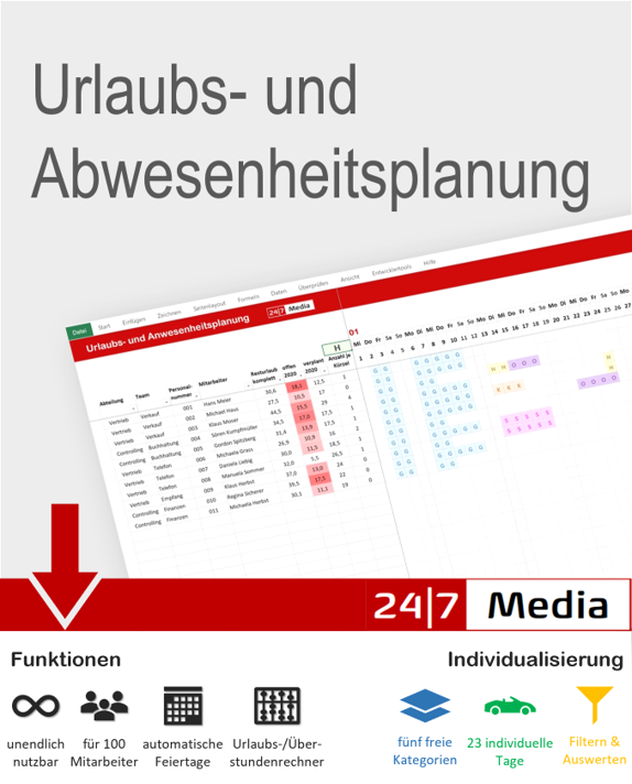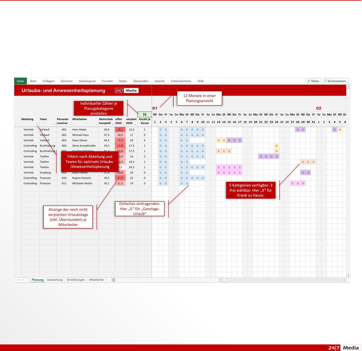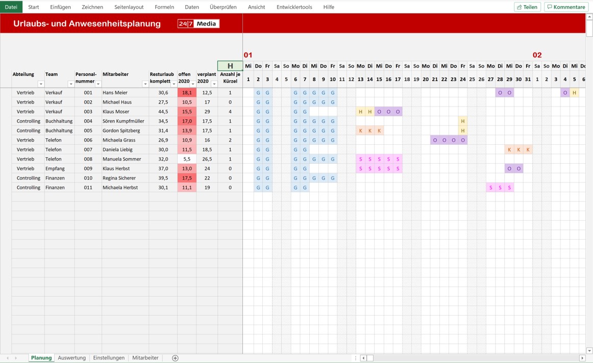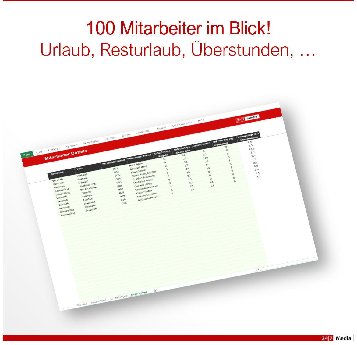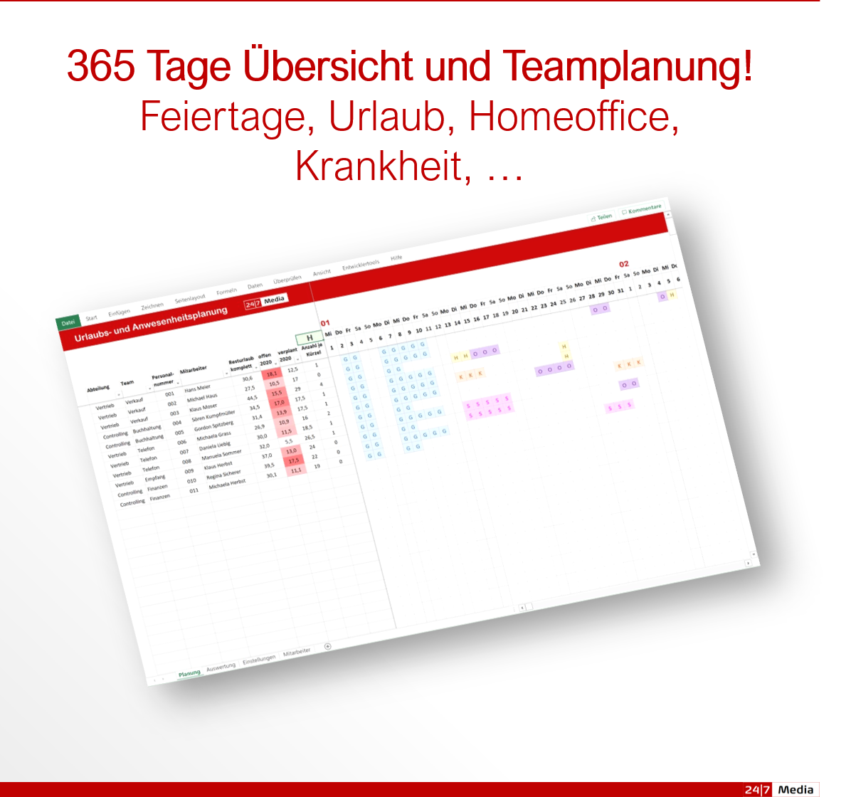 Urlaubs- und Anwesenheitsplaner für bis zu 100 Mitarbeiter - für viele Jahre verwendbar!