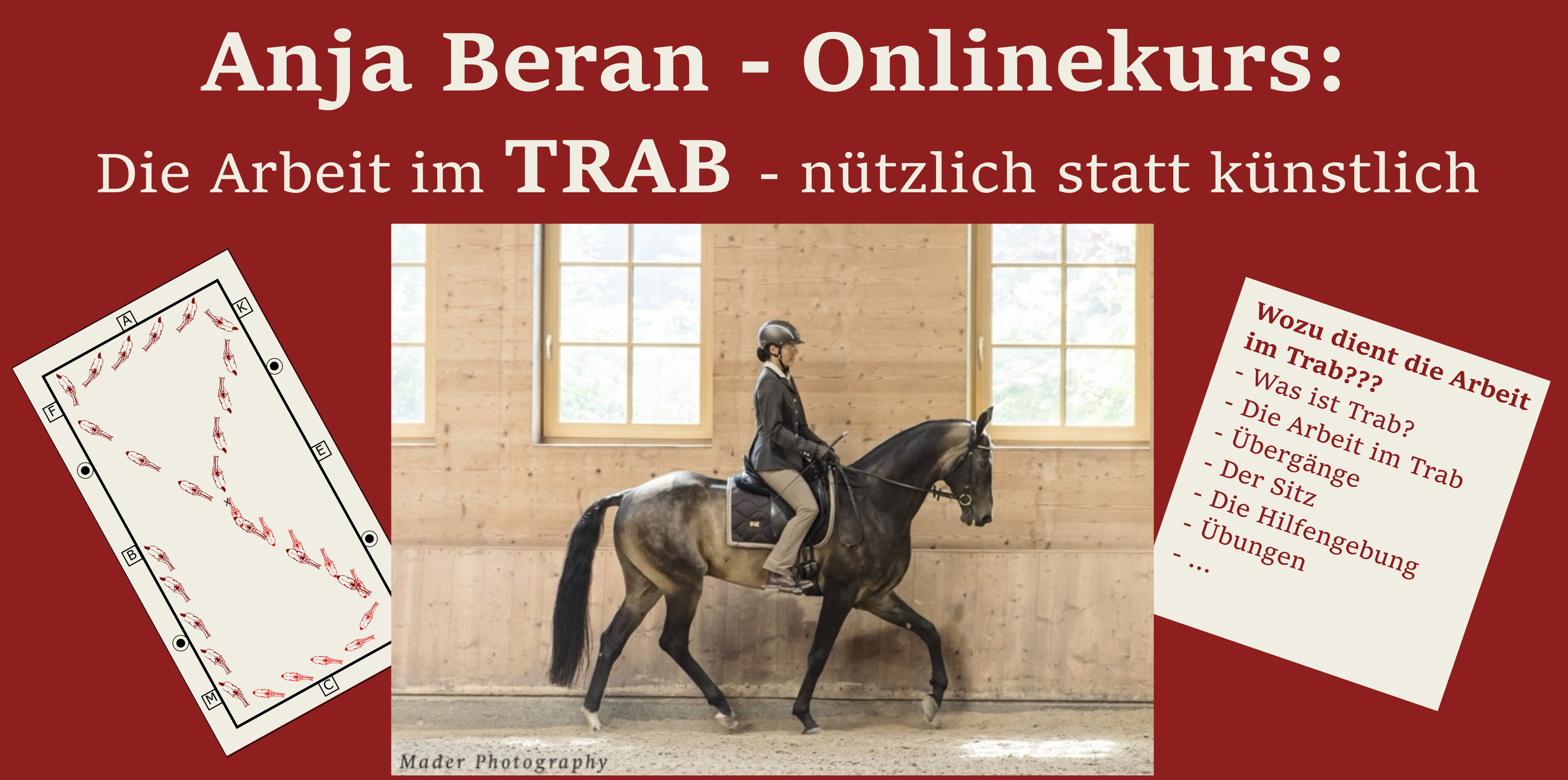 Nachdem wir bereits den Schritt und den Galopp ausführlich als Onlinekurs behandelt haben, folgt nun die letzte der 3 Grundgangarten - der TRAB! Dem Trab wird heutzutage ein unglaublich hoher Stellenwert beigemessen - verdient er diesen? Wie sieht die nützliche Arbeit im Trab für das Pferd aus? Worauf kommt es an? Entfernt sich der Trab immer weiter von der Natur des Pferdes?