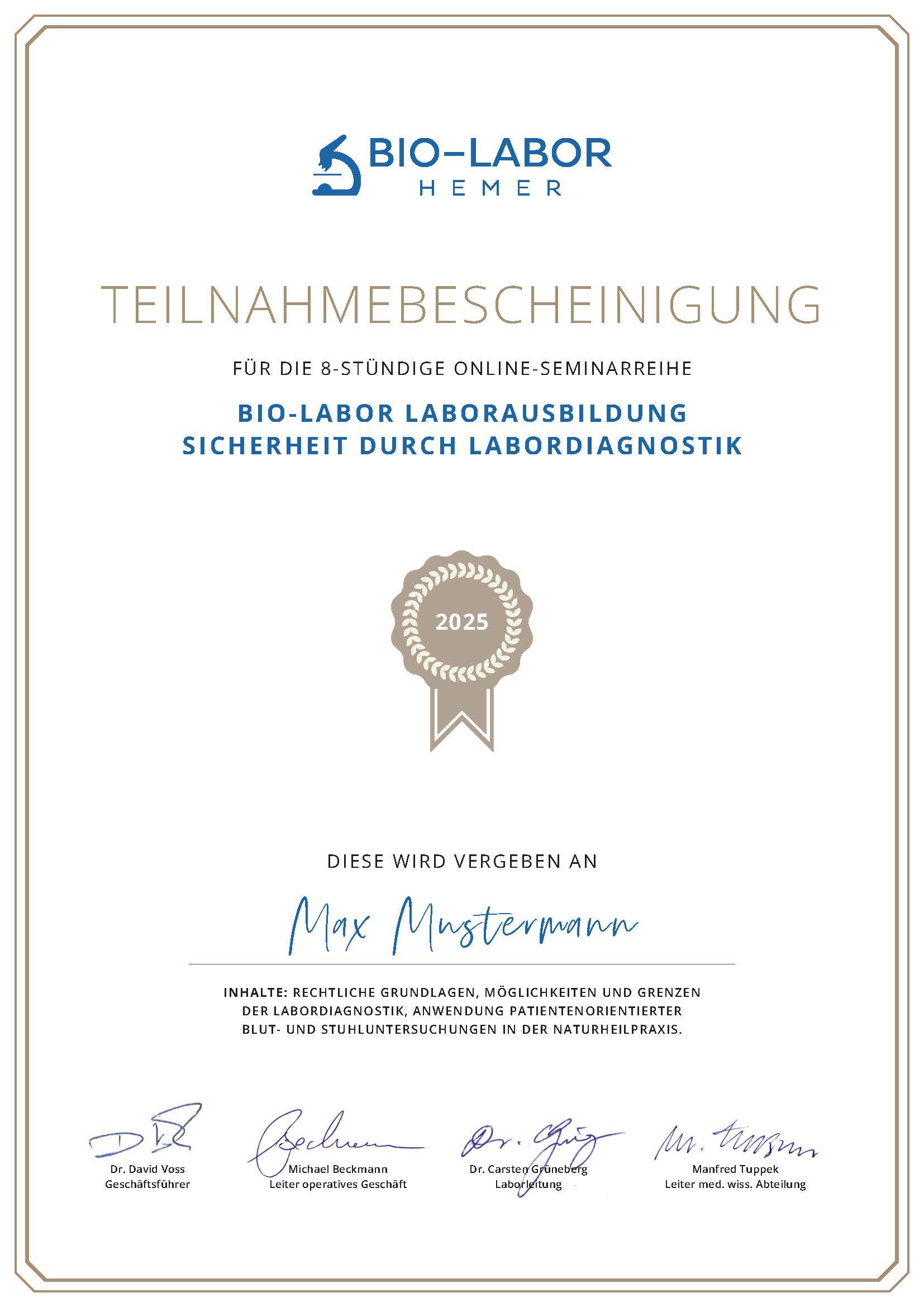 Mit dem Komplettpaket sichern Sie sich den Zugang zu allen vier Online-Seminaren der BIO-LABOR Labor-Ausbildung – inklusive individueller Teilnahmebescheinigung per Briefpost und exklusivem Fortbildungslogo für Ihre Website oder Ihren Social-Media-Kanal.
