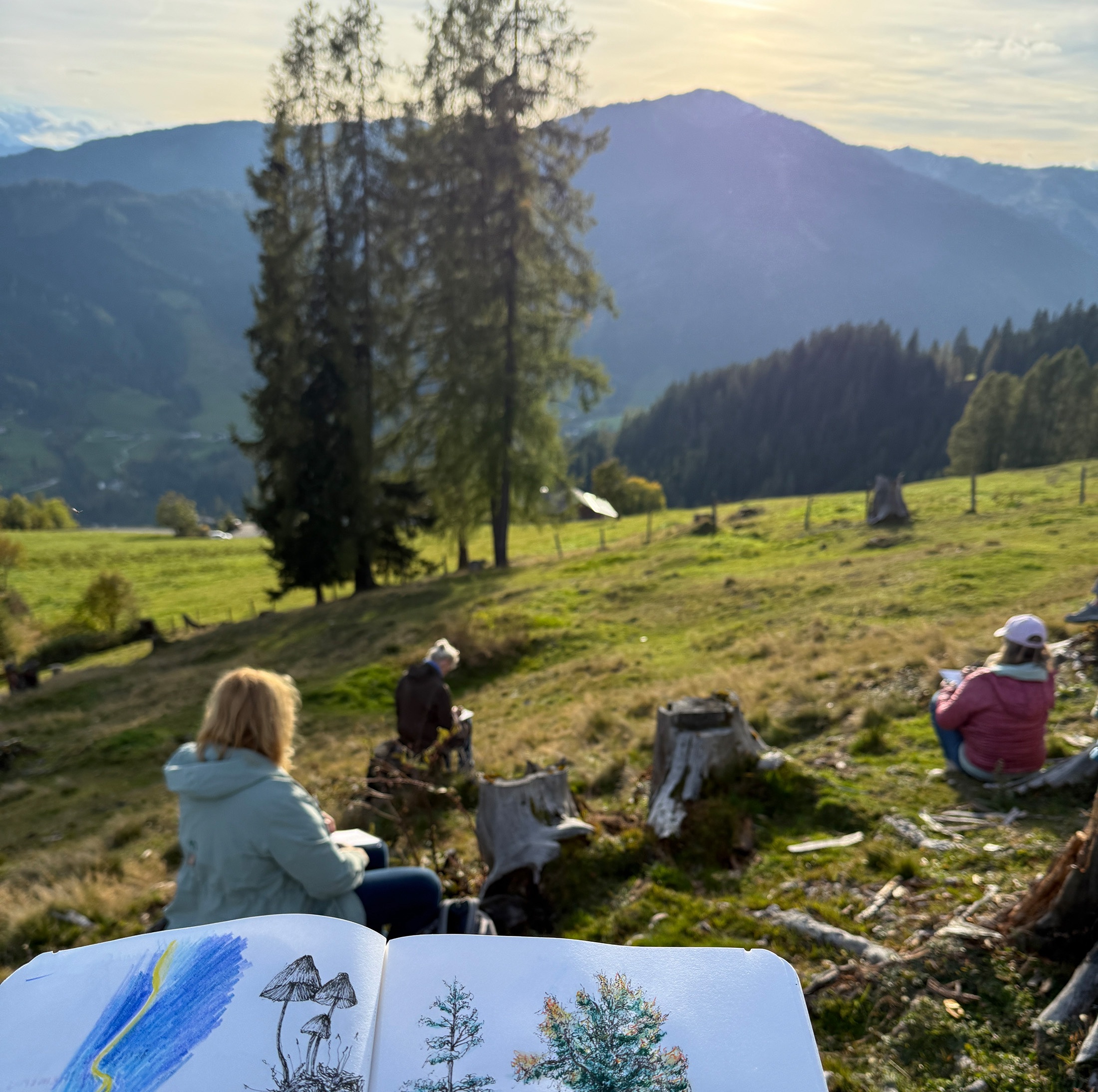 Es ist so ein Ort, wo alles andere in die Ferne rückt und wir uns in aller Ruhe auf unzählige beeindruckende Motive konzentrieren können. Auf die tolle Landschaft, auf feine Details der Kräuter und Baumarten rund um uns. Wir sehen uns dabei verschiedene Zeichenmethoden und Kolorationstechniken an, um ausdrucksstarke Zeichnungen zu erhalten.