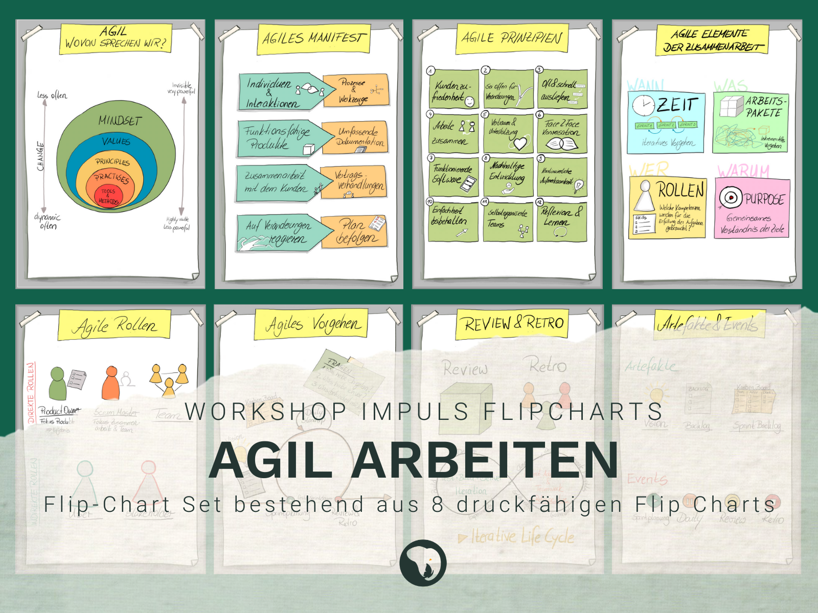 Agil in einem Workshop erklärt sich am besten durch Erleben. Dennoch braucht es einen Impuls zum Anfang. Um nicht am Bildschirm zu kleben, bieten sich Flipcharts an. Seit über 5 Jahren erklären wir nun schon das Thema „Agile Arbeitsweise“. Die besten Flipcharts (alle erprobt im Workshop-Einsatz) bieten wir hier zum Download an. In einem PDF sind 8 Flipcharts gebündet. Diese könnenauf 70x100cm bei einer Druckerei der Wahl gedruckt werden und sind somit als Flipcharts nutzbar. Zudem können sie natürlich auch auf DINA4 reduziert ausgedruckt werden oder an digital Whiteboards. Der Stil ist handschriftlich und gescribbelt. Sprache ist Deutsch mit englischen Fachbegriffen.