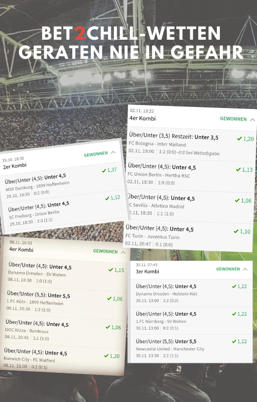 Die Kurzfassung: Ich setze ausschließlich auf „Unter 4,5“ oder „Unter 5,5“ Tore in einem Spiel und kombiniere so viele Partien miteinander, dass ich eine Gesamtquote zwischen 1,5 und 1,8 erhalte - meist zwei bis fünf.