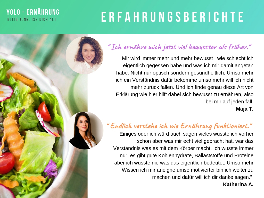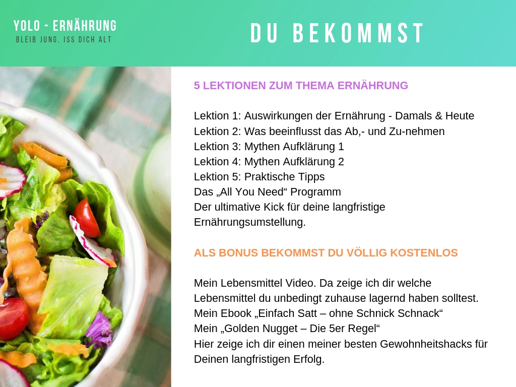 Aus diesem Grund habe ich YOLO – Ernährung kreiert. In diesem Kurs habe ich meine jahrelange Erfahrung im Bereich Ernährung zusammengefasst. Außerdem habe ich die besten Tipps die schon über 100 meiner Kunden geholfen haben abzunehmen einbezogen.