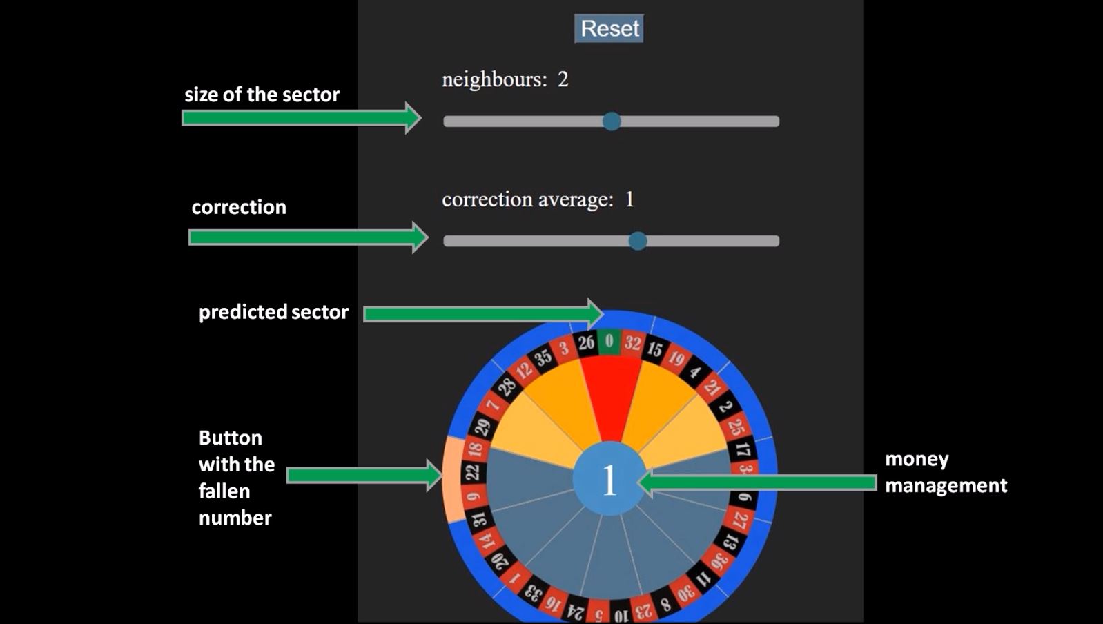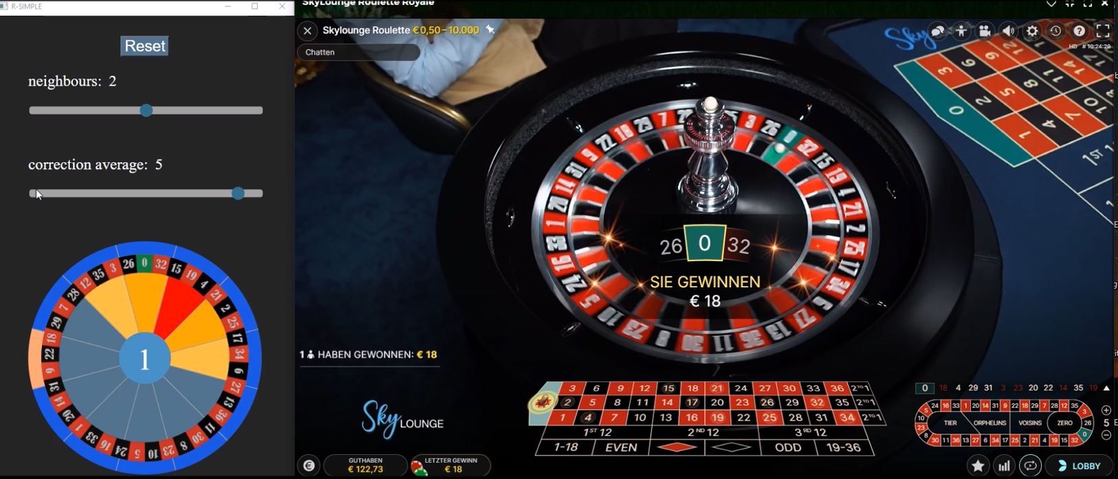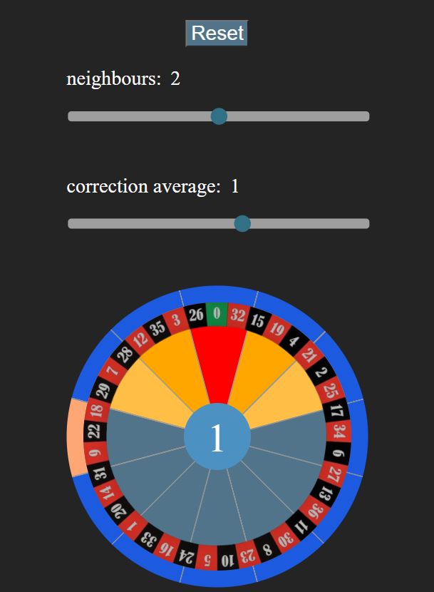 example: the programme calculates the upper sector with the zero 0, but the ball lands further to the right in the sector with the number 17.25, then we set the correction to the sector 17 so the programme learns and adapts to the deviation. the other controller is responsible for the play and the scatter. If the spread is too large, the sector is enlarged a little, which of course also adjusts the money management.