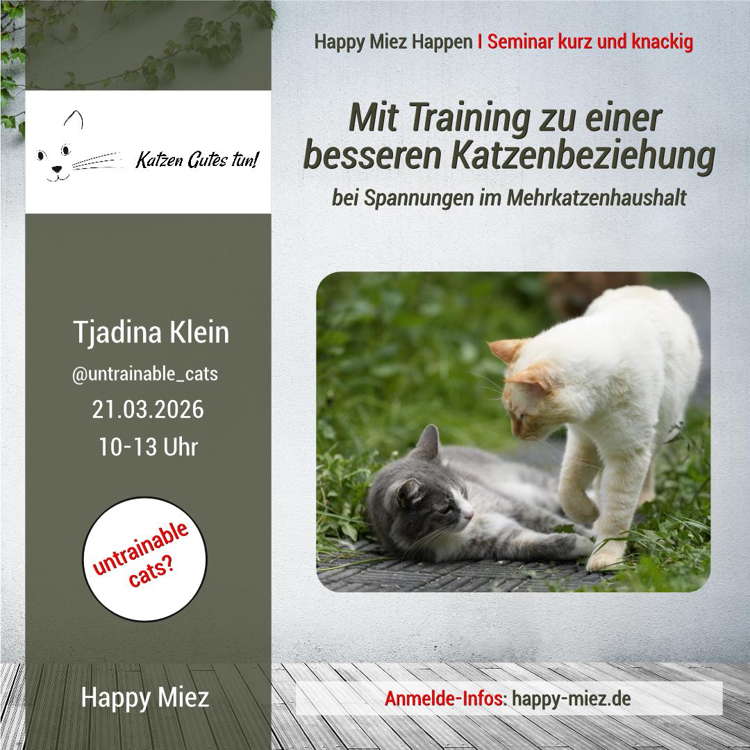 In diesem Seminar widmen wir uns genau diesen feinen, aber bedeutsamen Herausforderungen im bestehenden Mehrkatzenhaushalt. Ziel ist es, das Miteinander der Katzen schrittweise zu verbessern - von gegenseitigem Dulden zu mehr sozialer Nähe, gegenseitiger Toleranz und bestenfalls ersten Schritten Richtung Freundschaft.