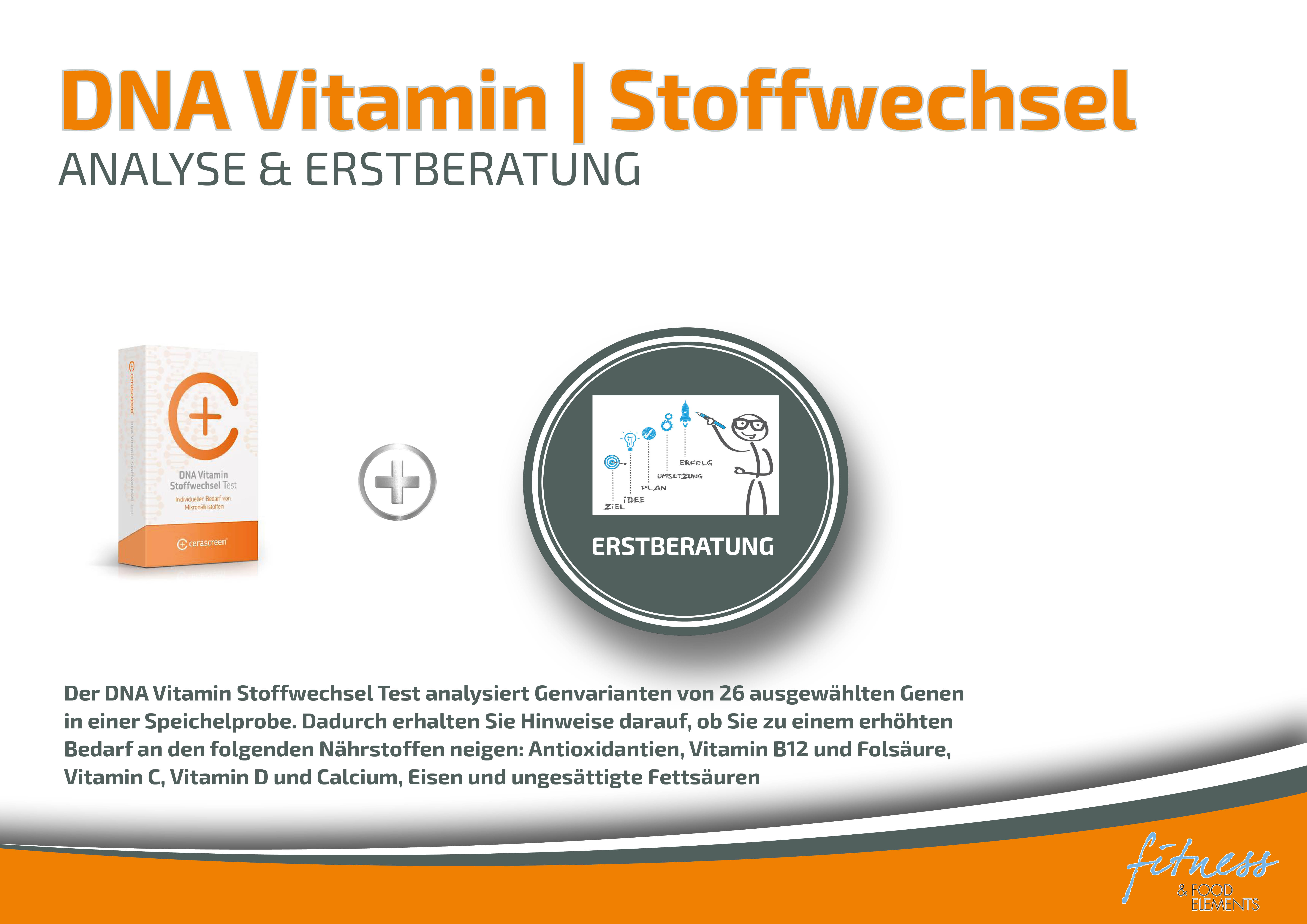 Der cerascreen® DNA Vitamin Stoffwechsel Test analysiert Genvarianten von 26 ausgewählten Genen in einer Speichelprobe. Dadurch erhalten Sie Hinweise darauf, ob Sie zu einem erhöhten Bedarf an den folgenden Nährstoffen neigen: Antioxidantien, Vitamin B12 und Folsäure, Vitamin C, Vitamin D und Calcium, Eisen und ungesättigte Fettsäuren.
