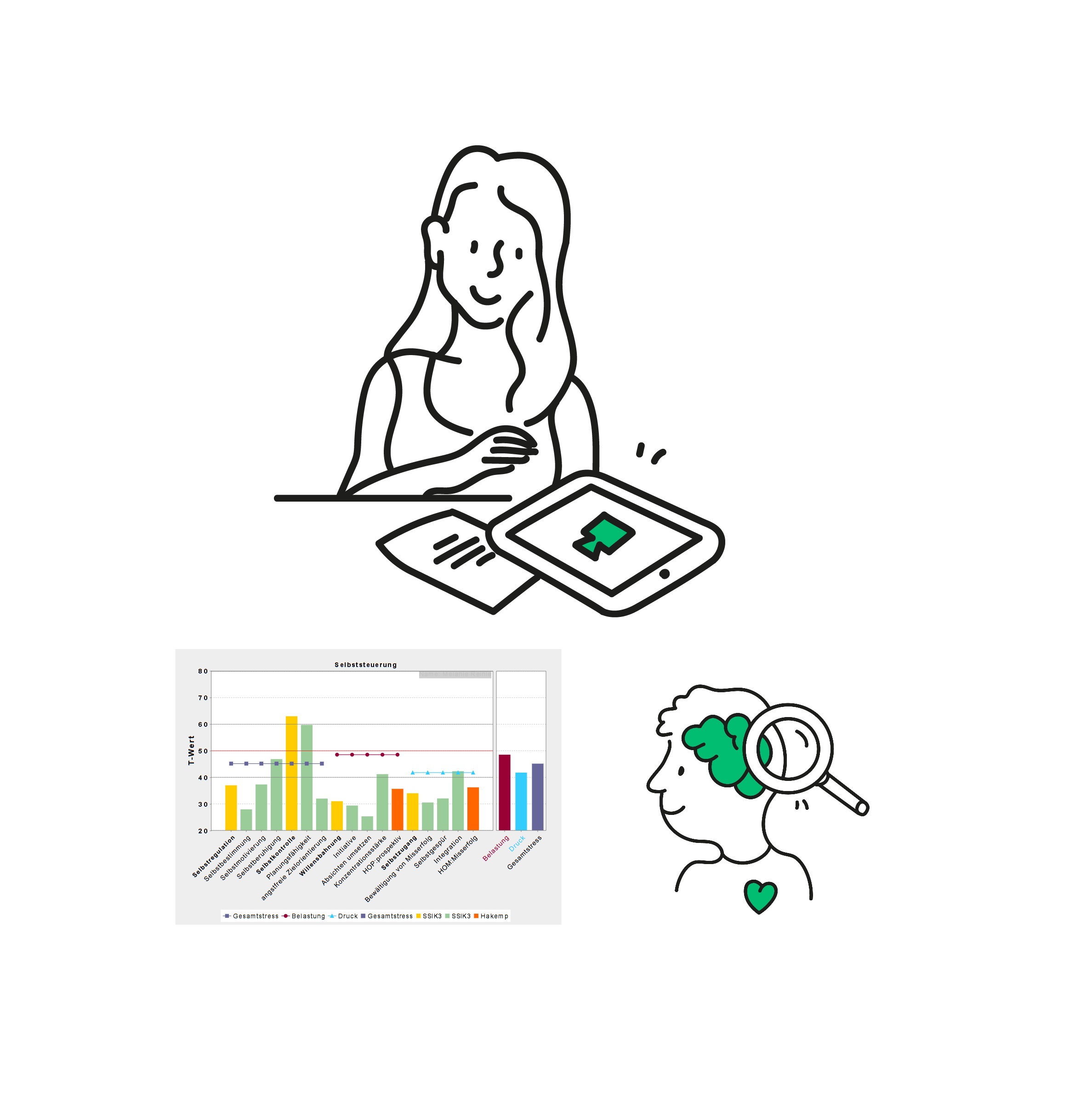 Selbststeuerungsinventar (SSIK3): Dieser Teil-Test der PSI-Diagnostik misst die Selbststeuerungskompetenzen, die einen Menschen befähigen, mit momentan subjektiv empfundenem Stress angemessen umzugehen. Das Selbststeuerungsinventar zeigt damit nutzbare Ressourcen und Entwicklungspotenziale für spezifische Lebenssituationen und -phasen auf. Selbststeuerungskompetenzen können ein Leben lang entwickelt und trainiert werden.