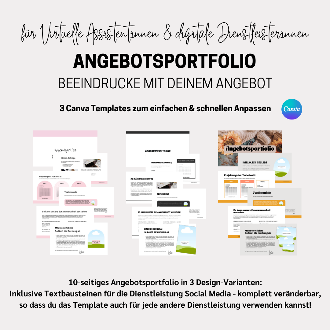 - 3 vorgefertige Designs des Angebotsportfolios, die du kinderleicht mit Canva (Freeversion reicht aus) an dein Branding anpassen kannst - wenn du willst. Du kannst die Templates auch so verwenden.