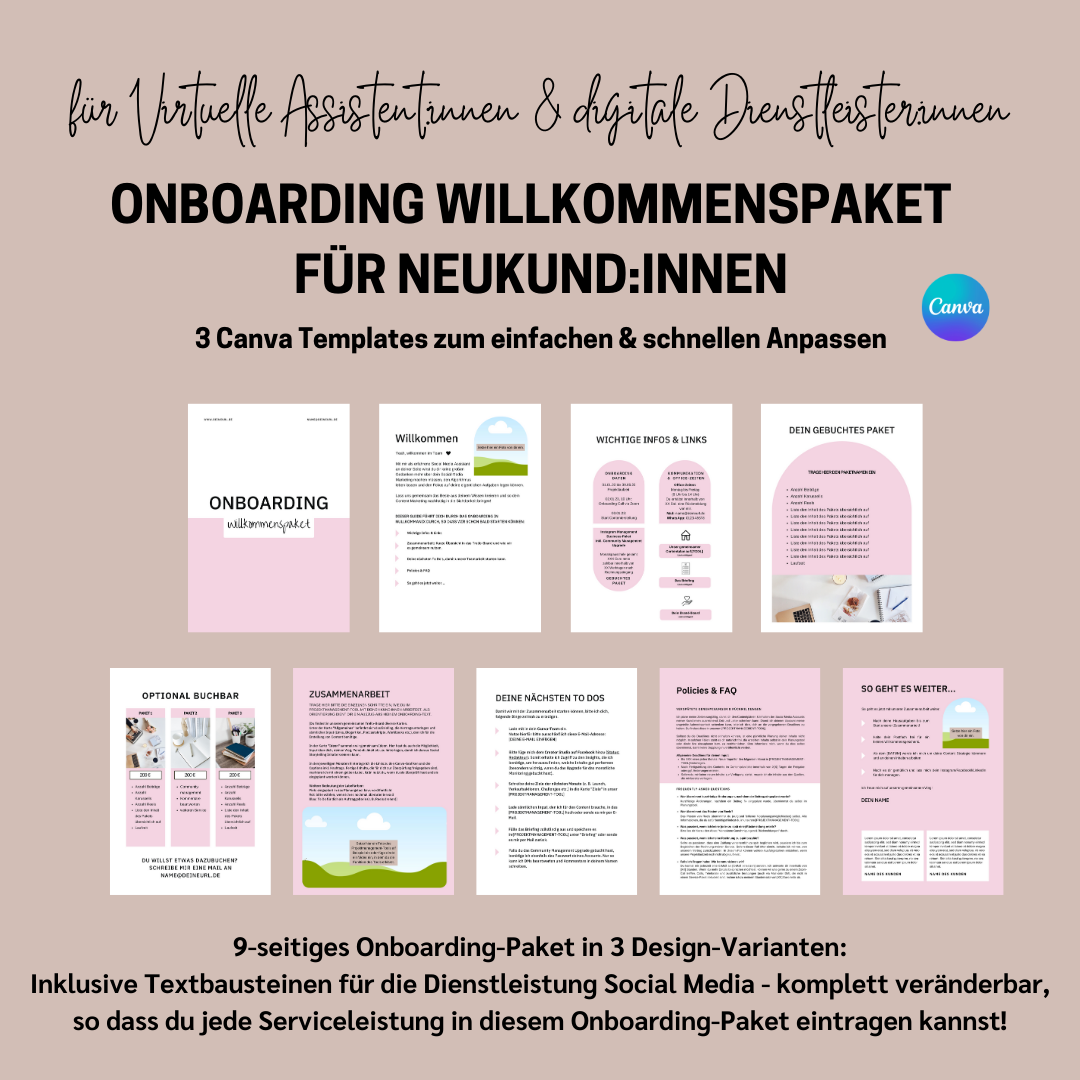 Dieses Onboarding-Paket ist für Virtuelle Assistent:innen & digitale Dienstleister:innen kreiert, die Social Media Management professionell anbieten, um deine Neukund:innen professionell und schnell in die Arbeitsprozesse einzuführen und über wichtige Details zu informieren. Aber auch jede andere Dienstleistung kannst du in dieses Onboarding-Template mit deinen Inhalten aufnehmen und deine Konditionen hinzufügen. Lass deiner Kreativität freien Lauf und verblüffe deine Neukund:innen mit einem hochwertigen und übersichtlichen Onboarding.