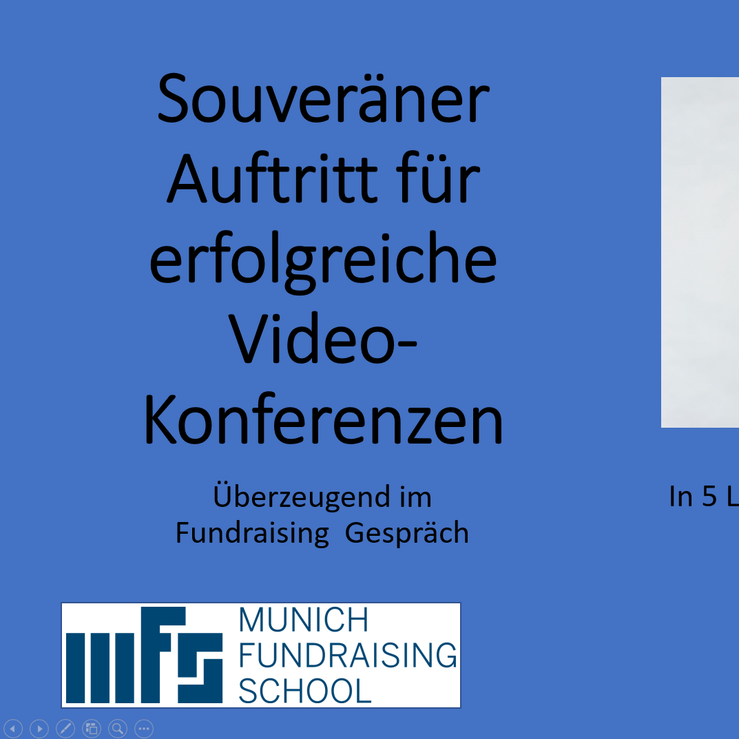 Ihr Videokurs „SOUVERÄN AUFTRETEN IN EINER VIDEOKONFERENZ“ zeigt, worauf es ankommt in der Videokonferenz mit dem eigenen Team, mit Spendern, Unterstützern oder Projektpartnern. In inhaltsstarken 5 Lektionen erfahren Sie, Videokonferenzen leicht und geschmeidig durchzuführen. Vom Setting, über Licht, Technik und Bildausschnitt bis hin zu Körpersprache und No Go’s lernen Sie einen perfekten Auftritt.