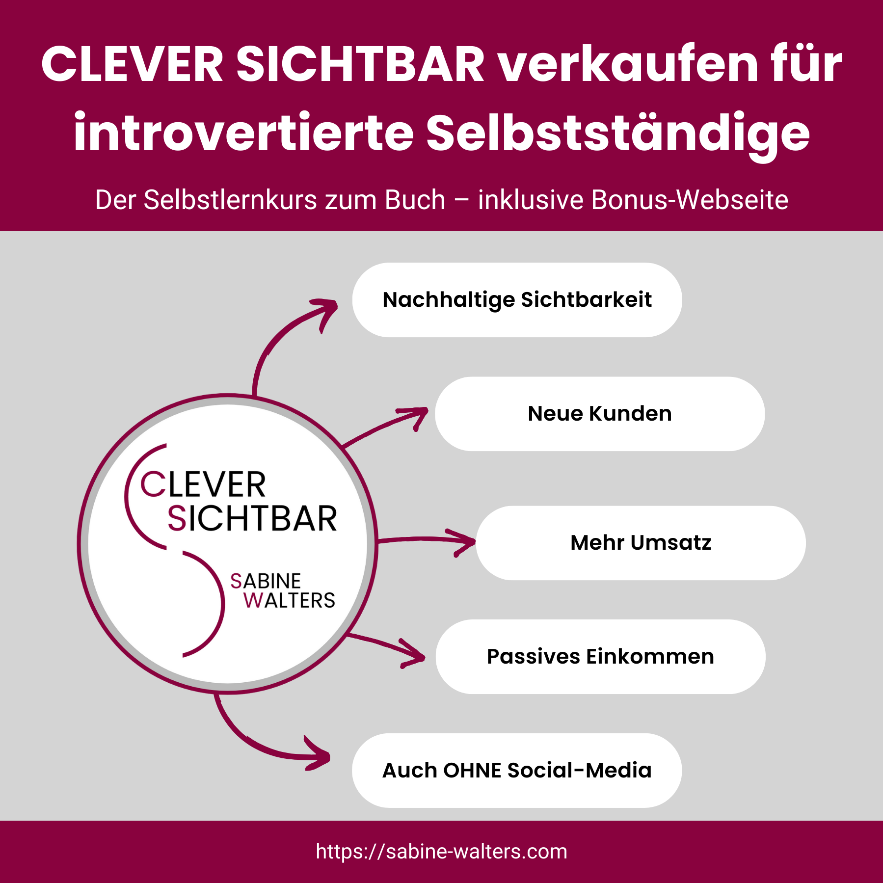 In "Clever sichtbar verkaufen für introvertierte Selbstständige" teile ich meine persönlichen Erfahrungen und Marketingstrategien, die speziell auf die Bedürfnisse von introvertierten Menschen zugeschnitten sind.