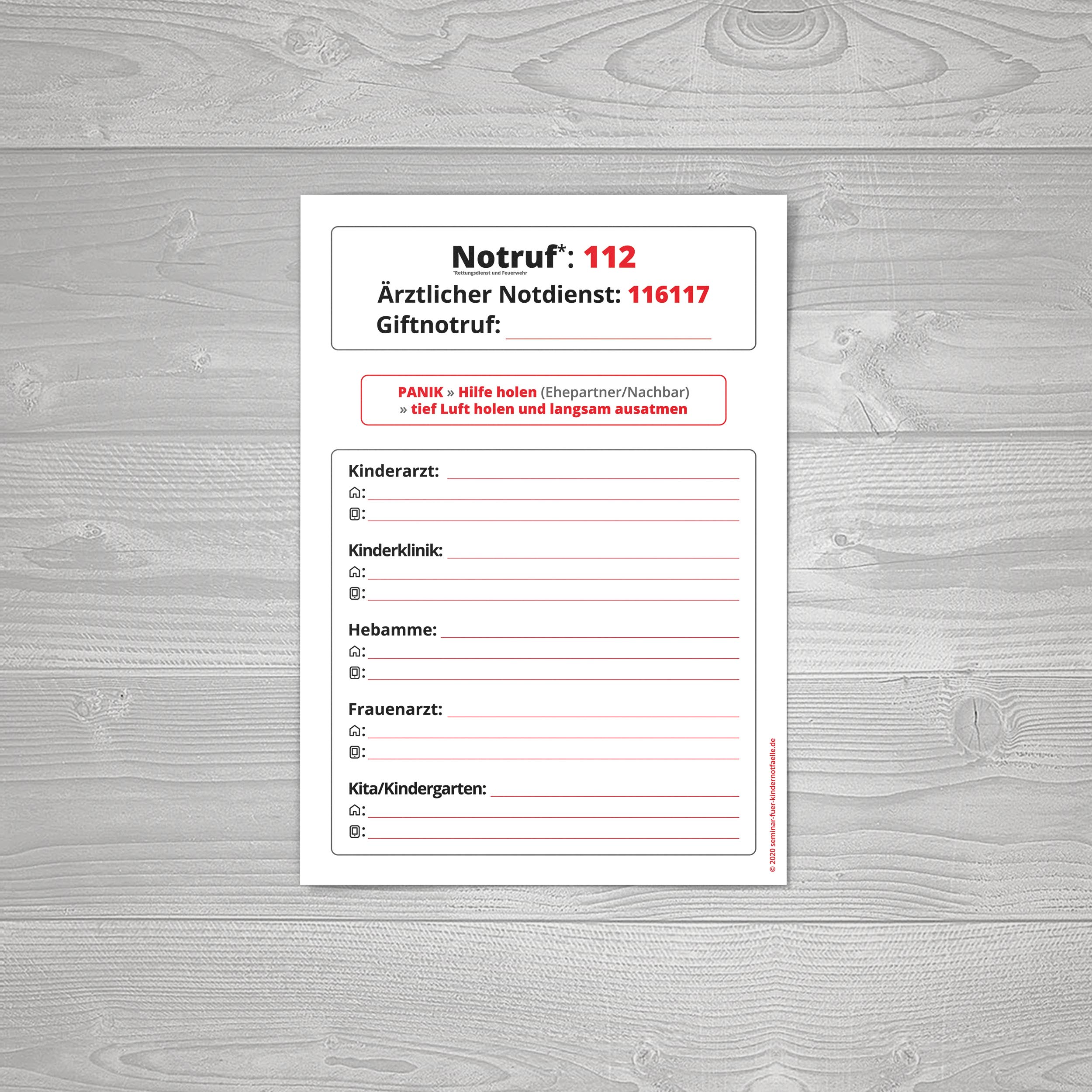 Der Grundgedanke liegt darin, im Notfall alle wichtigen Telefonnummern sofort griffbereit zu haben. Hier empfiehlt es sich, das ausgedruckte Plakat Zuhause an einen gut zugänglichen Ort aufzuhängen (z.B. der Kühlschrank in der Küche).