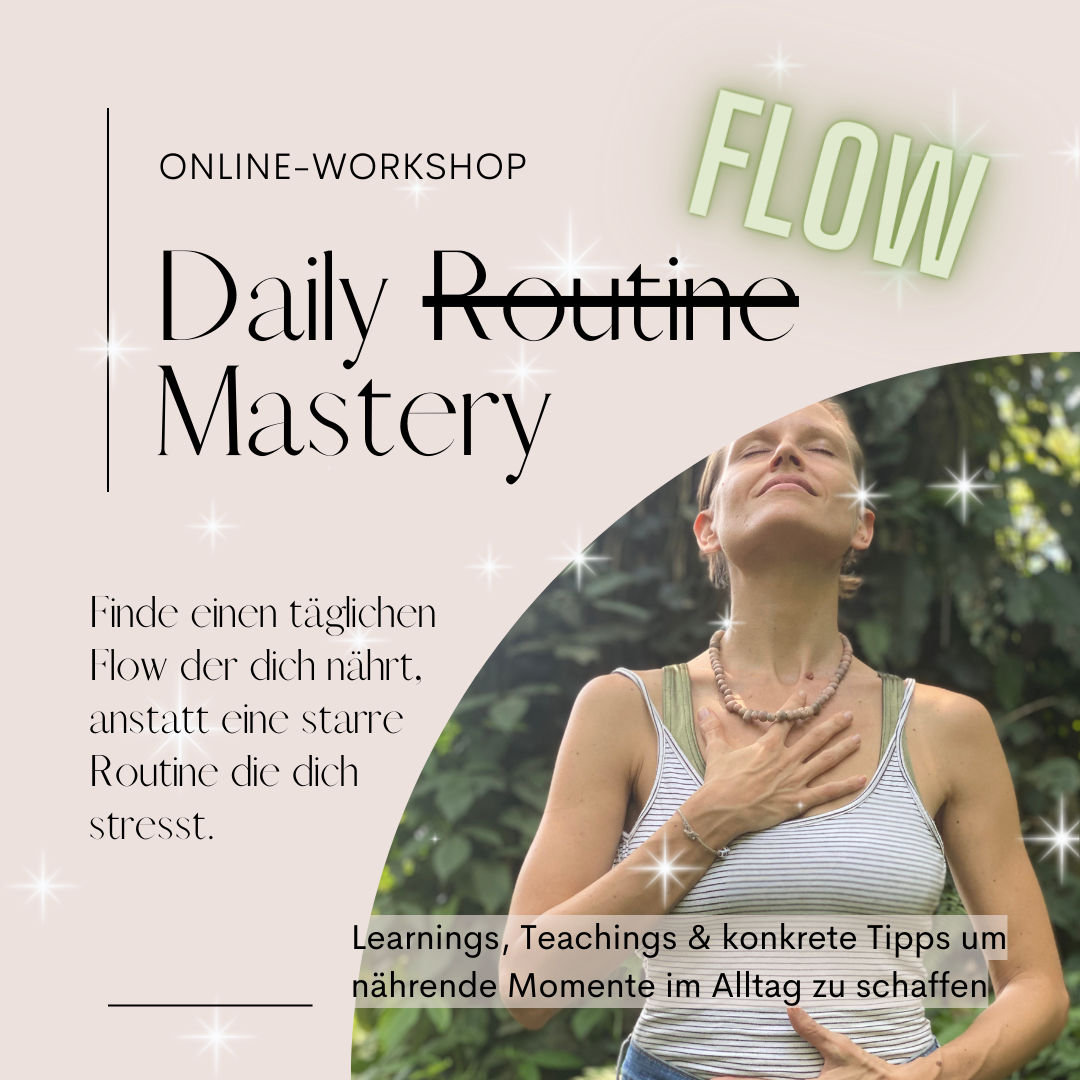 👉🏼 In unserem Workshop „Daily Routine (Flow) Mastery“ zeigen wir dir, wie du eine undogmatische, nährende Routine entwickeln kannst, die sich deinem Leben anpasst und nicht umgekehrt. Melde dich an und lerne, wie du jeden Tag in deinem eigenen Tempo und nach deinen eigenen Bedürfnissen gestalten kannst, um deine Tage bewusst und achtsam zu leben.