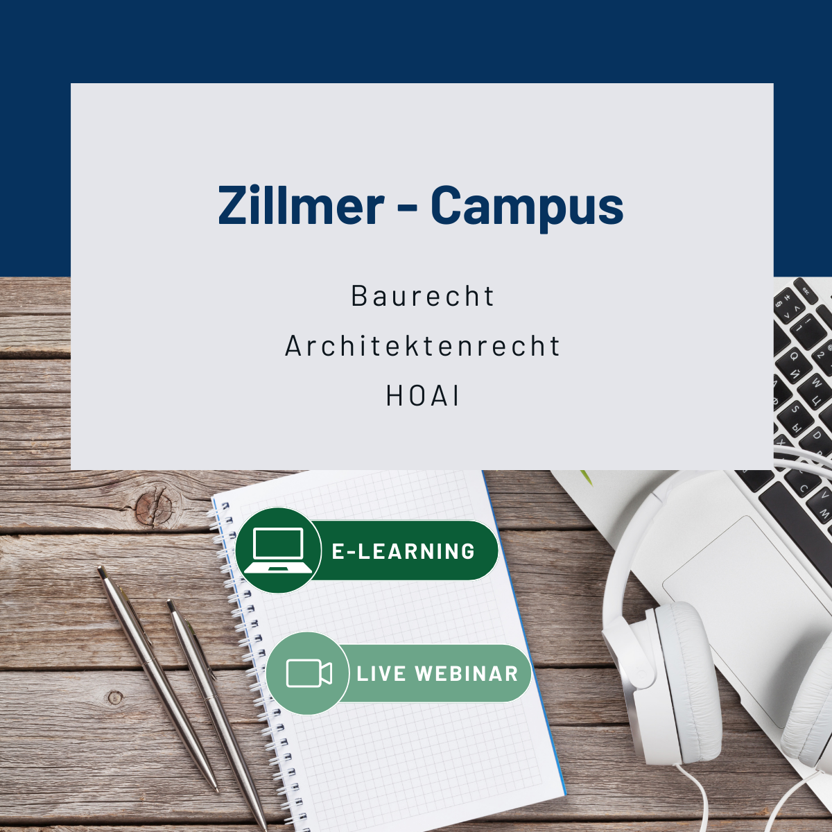 Sie wollen das Baurecht verstehen und effizient, flexibel und auf den Punkt einsetzen können? Mit dem Zillmer-Campus lernen Sie in Ihrer eigenen Geschwindigkeit online und können mindestens 6x pro Jahr bei den Vorträgen Ihre Fragen stellen und auf die E-Learning-Inhalte jederzeit zugreifen.