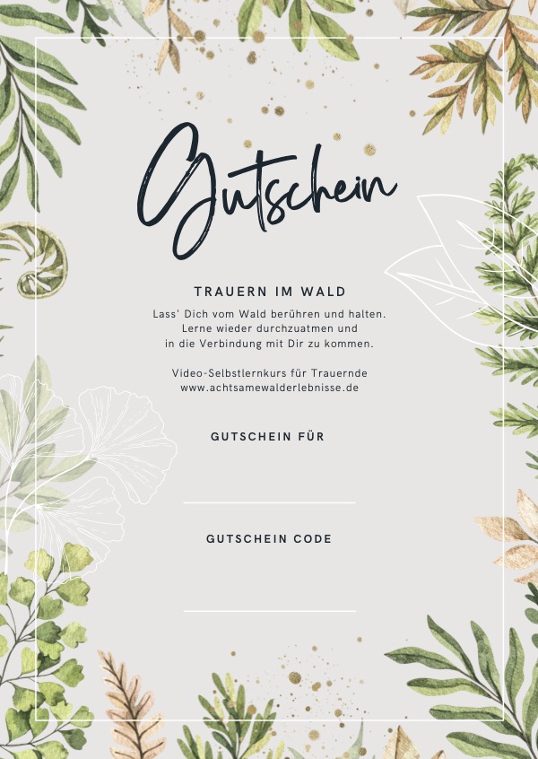 Beschenke einen Trauernden, damit dieser sich in der wohltuenden und heilenden Atmosphäre des Waldes in der Trauer Selbst wahrnimmt und die Verbindung zu sich, zu dem was er/sie betrauert und zur Natur stärkt.