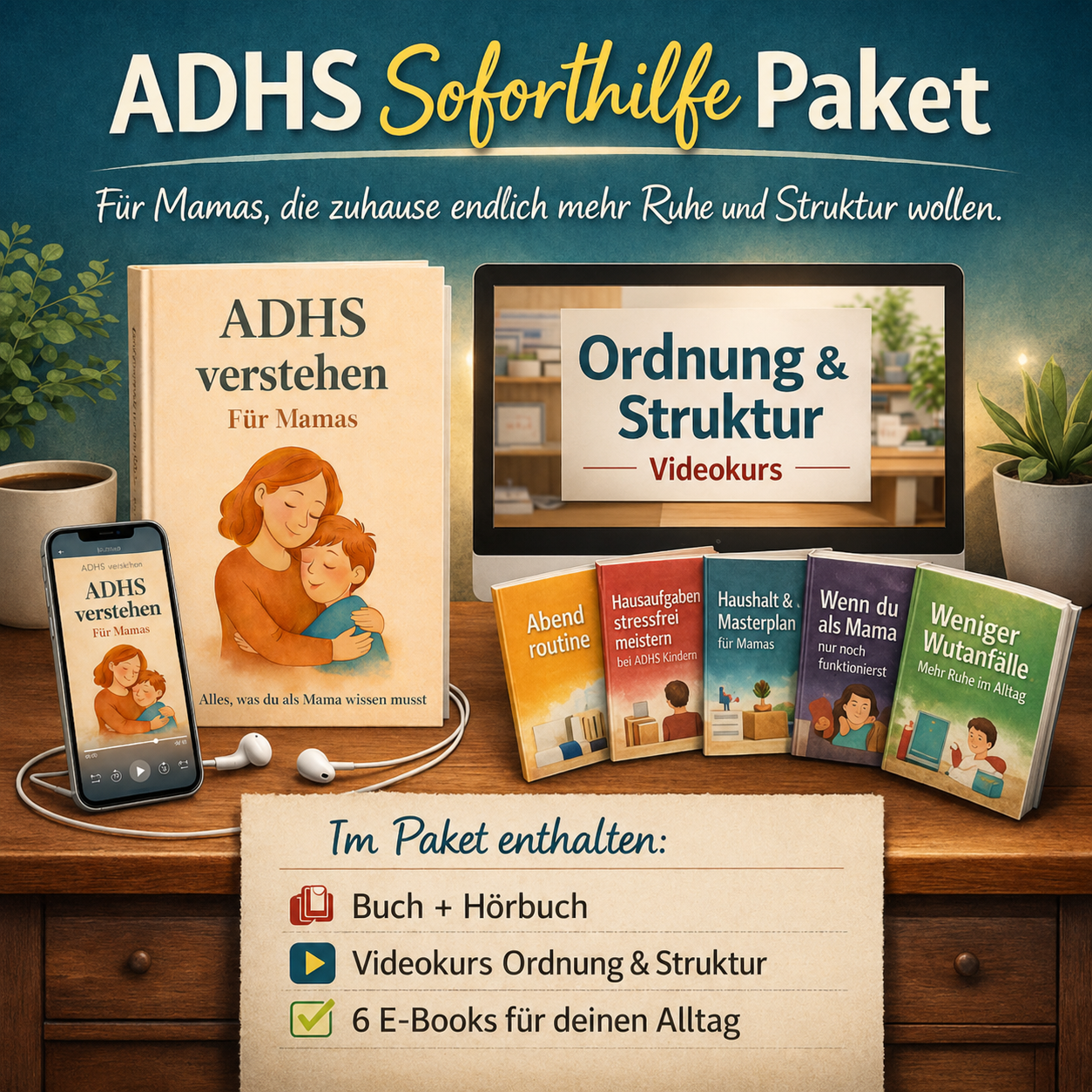 Mit Buch + Hörbuch, dem Videokurs Ordnung und Struktur und mehreren kompakten E-Books bekommst du endlich einen klaren, alltagsnahen Weg, der euch zuhause spürbar entlasten kann.