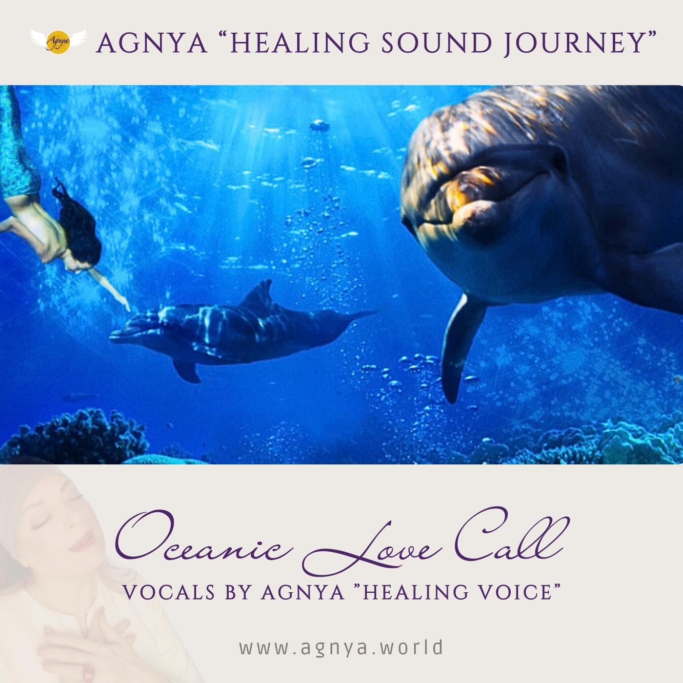 JOURNEY IN THE HEALING SOUND OF THE OCEAN 4 magically beautiful ocean worlds await you with their regenerating vibrations. Glittering waves and joyful calls of dolphins (the "angels of the seas") accompany you, while gentle whales circle peacefully. Together with AGNYA's intuitive healing singing, they invite you to a 45-minute sound bath with heart-opening vibrations that weave themselves into an OCEANIC LOVE CALL.