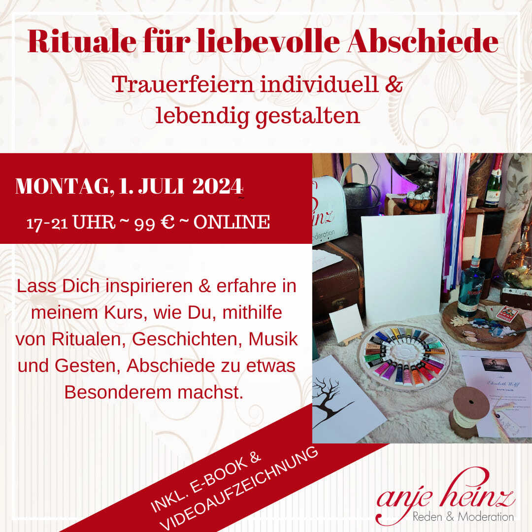 In diesem einzigartigen Seminar erlebst du 4 Stunden voller inspirierender Ideen und kreativer Rituale und Gesten, um Trauerfeiern liebevoll und persönlich zu gestalten.