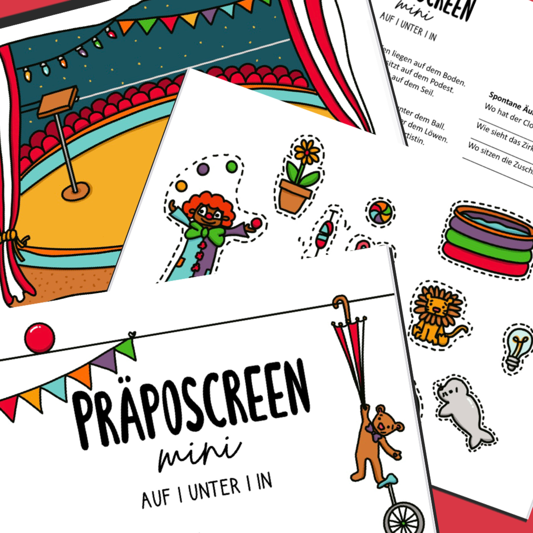 Mit diesen liebevoll gestalteten Screenings könnt ihr mühelos die wichtigsten lokalen Präpositionen überprüfen. Das bunte Zirkussetting lädt zum Mitspielen ein und macht den Kindern beim Erkunden große Freude. Die Präpositionen wurden hier bewusst nicht in einem "häuslichen Umfeld" gestaltet, da viele Präpositionen schon gemeinsam mit den Gegenständen abgespeichert und im täglichen Gebrauch sind. Was dieses Screening noch besonders macht, ist die Tatsache, dass nur die Präpositionalphrase sprachlich geäußert wird und somit auch Kinder mit einem eingeschränkten Arbeitsgedächtnis überprüft werden können.