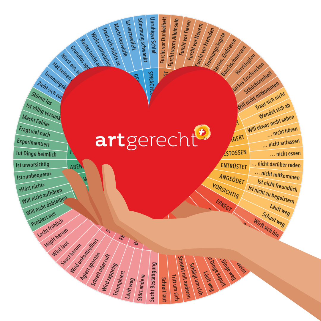 Im äußersten Ring siehst du, was ein Kind bei einem bestimmten Gefühl typischerweise tut. Häufig interpretieren wir Erwachsenen das Verhalten des Kindes nämlich falsch. Um den innersten Kreis gruppiert findest du eine Liste, die die Basis Emotionen auslösen können.