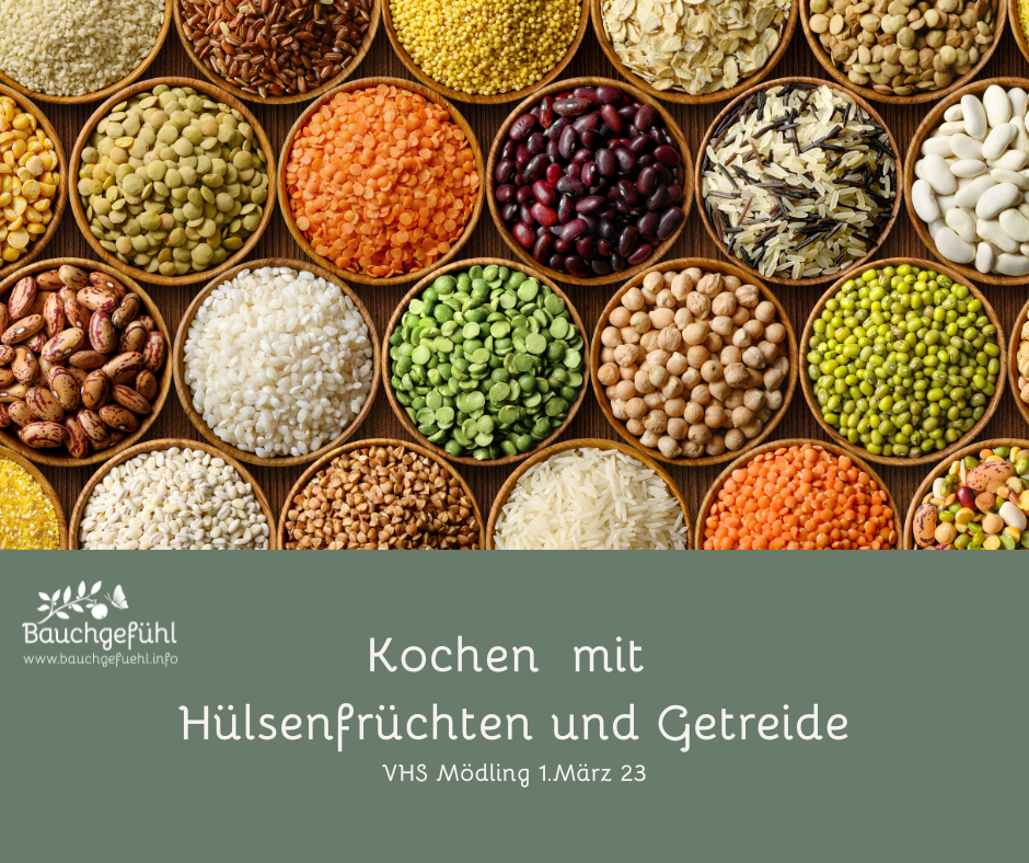 Rezepte des Kochkurses "Kochen mit Hülsenfrüchten und Getreide" aus dem Kurs an der VHS Mödling, am 1.3.2023