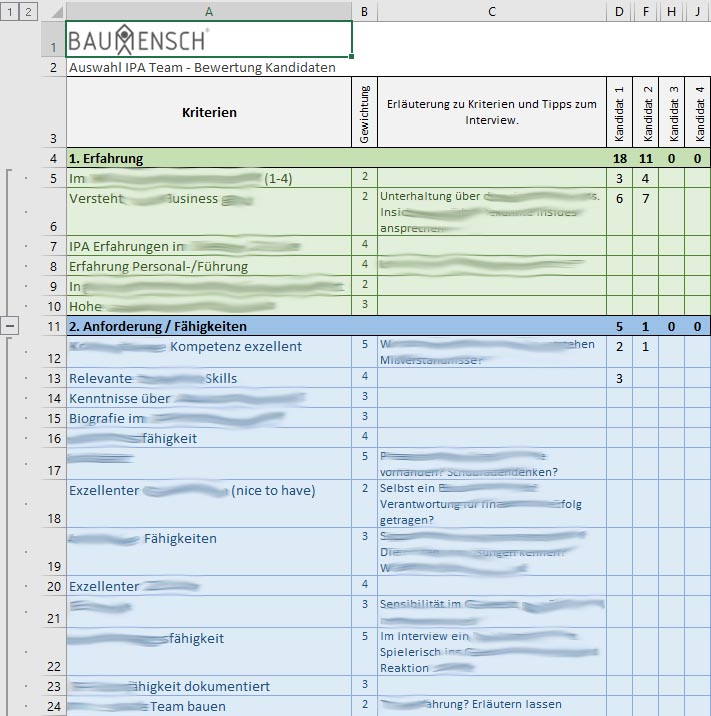 Bewertungsmatrix zur Auswahl eines IPA-Teams. Kandidaten werden anhand von relevanten Kriterien bewertet. Alle Kriterien können individuell gewichtet werden. Die vorgegebenen Kriterien haben sich in hunderten IPA Projekten bewährt, können aber auch individuell erweitert werden. Die Tabelle ist für vier Kandidaten vorbereitet, kann aber x-beliebig erweitert werden. Alle Felder lassen sich bearbeiten. Die Berechnung der Bewertungspunkte erfolgt automatisch - Gewichtungen werden automatisch berücksichtigt.