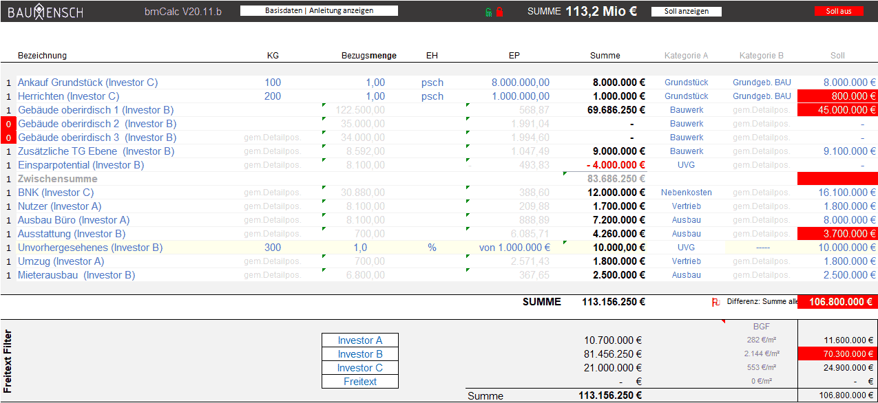Hier bekommst Du bmcalc, die ultimative Excel Vorlage für Baukosten und Projektkosten. Unser Tool unterscheidet sich von anderen Baukosten-Excel-Tabellen aus dem Internet. Das Tool funktioniert wie eine Baukostensoftware. Die Exceltabelle bietet u.a. Funktionen zur Variantenberechnung, Filterung und Auswertung der Kosten. Damit lassen sich Kostenschätzungen und Kostenberechnungen einfach und übersichtlich erstellen. Alle Infos zu unserer Excel-Vorlage findest Du hier. Die Excel Vorlage bietet verschiedene Darstellungsarten: DIN 276 mit einfacher Auswahl der Kostengruppen, Freitextfilter, Gruppenpositionen, Massenansätze, EP-Ermittlung für Benchmarks u.v.m.