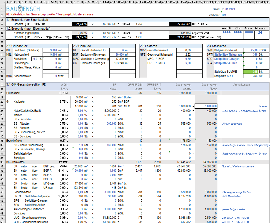 Diese Excel Berechnungstabelle ist eine Developer-Kalkulation. Sie wurde für Immobilien Projektentwickler entwickelt und wird von Unternehmen genutzt, die Grundstücke kaufen, um eine Immobilienentwicklung zu starten. Mithilfe der Planungsdaten berechnet man das Renditeergebnis, das sich aus den eingegebenen Werten (Kostenschätzung, Mieterträge, Finanzierungskosten usw.) ergeben. Mehr Info zu dem Tool findest Du hier.