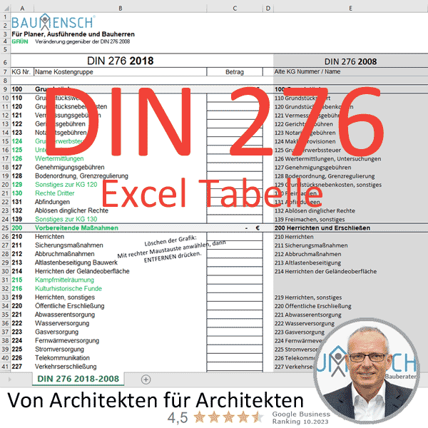 Hier bekommst Du eine Excel Datei mit der kompletten Struktur der aktuellen DIN 276-2018 bis zur 3. Gliederungsebene. Unsere Excel enthält zusätzlich die DIN 276 von 2008, auch bis zur 3. Gliederungsebene. Die dritte Ebene ist für die Anerkennung bei Banken und für Benchmarks wichtig. Die Versionen 2018 und 2008 sind in der Tabelle gegenübergestellt. So lassen sich die Unterschiede leicht ablesen. Das hilft Architekten bei der Kosten- und Honorarberechnung. Die Datei kannst Du gleich nach dem Bezahlen ohne sonstige Verpflichtungen herunterladen. Wir bieten auch Trainings und Seminare zur Erstellung von Kostenberechnungen an - einfach hier anfragen. Bei Fragen erreichst Du den Autor der Tabelle telefonisch unter 02051-311255.