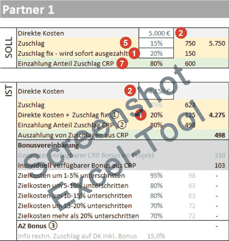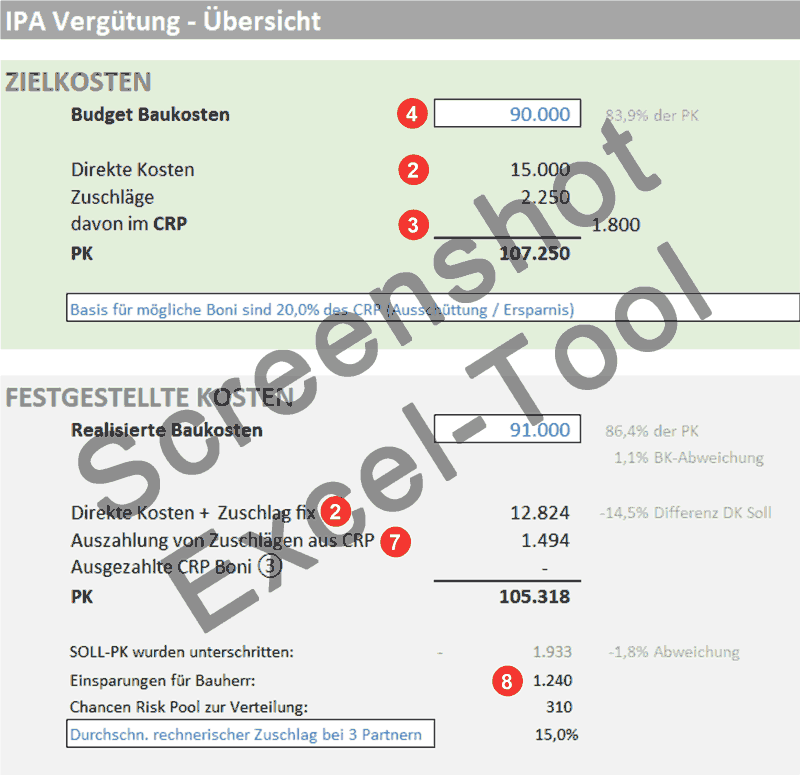Mit diesem Excel-Tool berechnet man die Vergütung der Partner in IPA-Projekten (Lean Construction). Diese Version ist ausgelegt für 5 Partner. Dieser Artikel auf Baumensch erläutert das Thema Vergütung in IPA-Projekten. Hier bekommst Du das passende Werkzeug, mit dem Du die Vergütung aller Projektpartner und Bauunternehmer in IPD / IPA Projekten berechnen kannst. Die Vergütung erfolgt anders, als in konventionellen Projekten. Die IPA.Methode und Vergütungslogik führt nachweisbar zu besseren Ergebnissen. Es gibt viel Theorie zum IPA-Berechnungsmodell, aber keine Vorlagen, um konkrete Berechnungen durchzuführen. Wenn Du im IPA-Projekt noch mehr Partner einbinden möchtest, dann schreib uns eine Nachricht. Wir stellen dann ein entsprechendes Tool zur Verfügung.