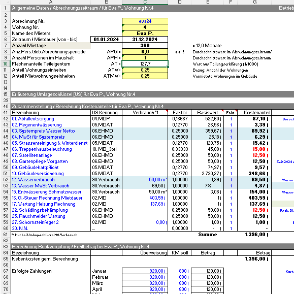 Hier handelt es sich um eine Exceltabelle mit eingebauten Formeln zur automatischen Abrechnung von Betriebskosten bzw. zur Erstellung von Nebenkostenabrechnungen. Das Tool ist Ideal für private Vermieter von Wohnungen in Mehrfamilienhäusern oder von einzelnen Wohnungen. Die Tabelle ist sehr flexibel und lässt sich leicht an individuelle Bedürfnisse anpassen. Rückfragen zur Anwendung der Tabelle werden vom Autor beantwortet.