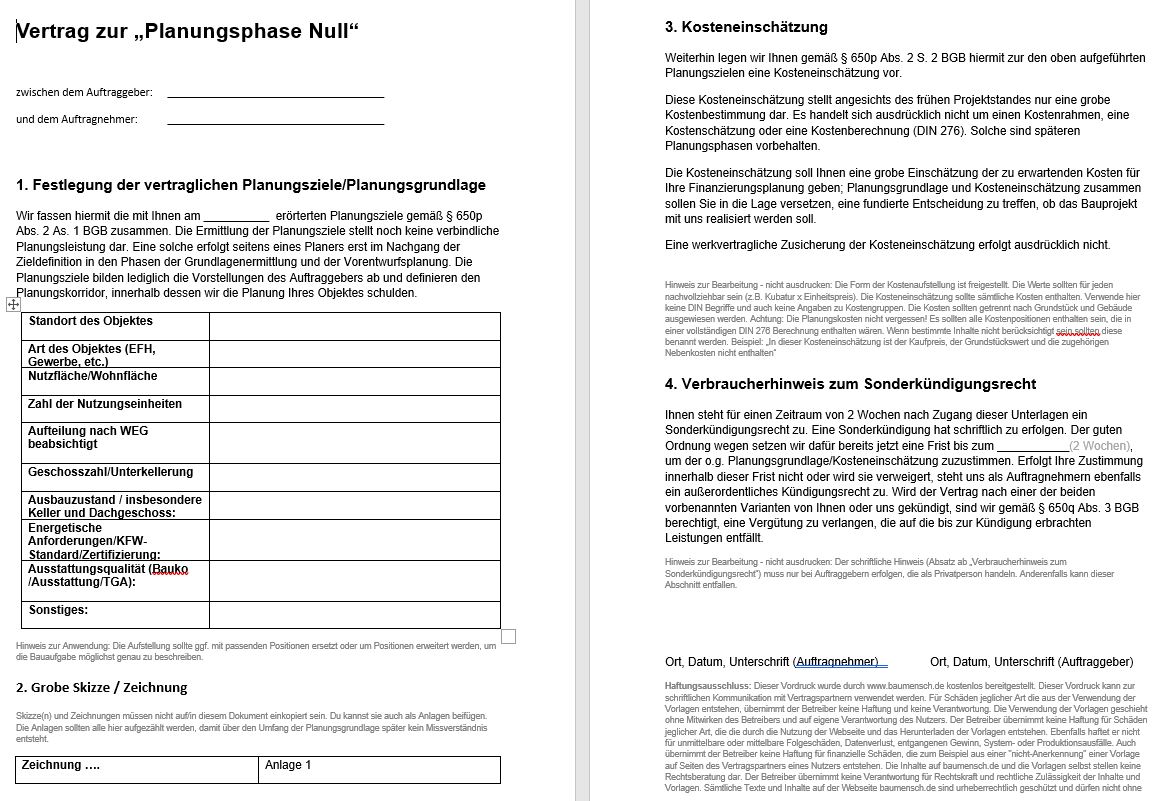Ein Architekt schuldet die mangelfreie Erstellung eines Hauses und damit einen Erfolg. Daher ist ein Planervertrag ein Werkvertrag. Der Planer hat Aufklärungs-, Beratungs- und Hinweispflichten. Vor dem eigentlichen Planervertrag, sollten die Planungsgrundlagen ordentlich ermittelt werden. Diese Grundlagen werden in der sogenannten Phase Null ermittelt. Dazu dient die Word-Vorlage als einfache Vertragsvorlage.