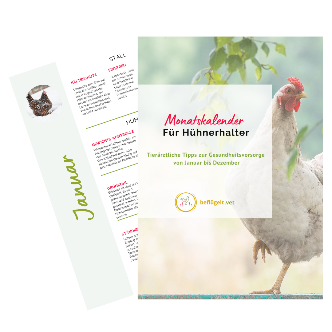 Erhalte 69 tierärztliche Tipps zur Gesundheitsvorsorge von Januar bis Dezember und lerne wie du Hühner zu jeder Jahreszeit gesund & artgerecht versorgst, damit Gesundheitsprobleme erst gar nicht auftreten. Damit brauchst du nicht mehr lange überlegen, was du deinen Hühnern gerade noch Gutes tun kannst, sondern schaust einfach nach, was sie gerade brauchen.