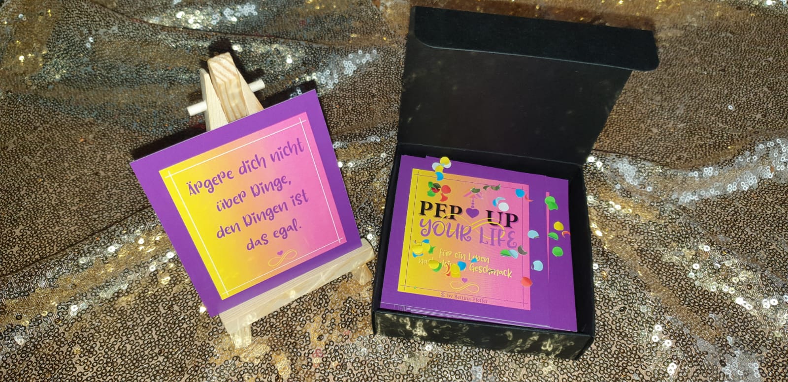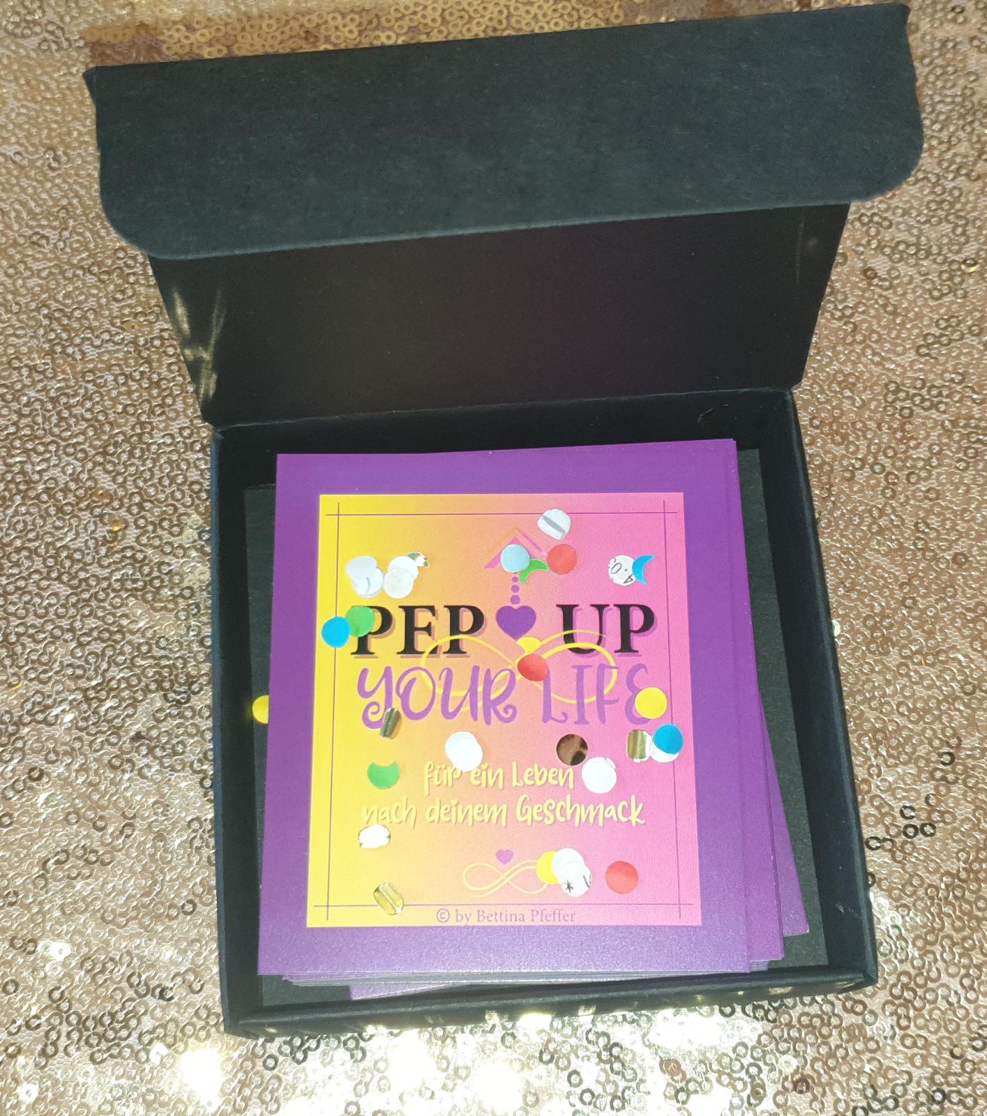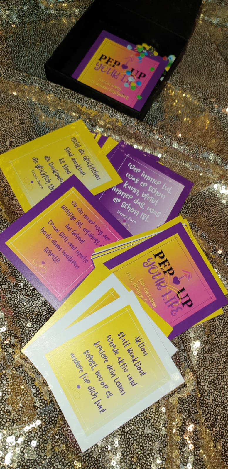 Dieses Pep-up-your-life Kartenset besteht aus 52 Karten und unterstützt dich im Alltag oder je nach Bedarf. Gib deinem Leben Pep und nutze die Karten für ein Leben nach deinem Geschmack! Ziehe eine Karte und stelle sie auf die kleine Staffelei zur Erinnerung und Motivation. Gib deinem Leben Leichtigkeit, Freude, Motivation und Pep! Nutze die Karten auch als Geschenk und bringe mehr Pep in die Welt!