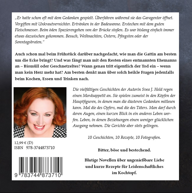 Die vielfältigen Geschichten der Autorin Svea J. Held regen einen Mordsappetit an. Sie spielen zumeist in den Köpfen der Hauptfiguren, in denen man die düsteren Gedanken mitlesen kann. Mal die des Opfers, mal die des Täters. Man darf durch deren Augen einen kurzen Blick in ein anderes Leben werfen. Leben, in denen Beziehungen einen weniger glücklichen Ausgang nehmen. Die Gerichte aber stets gelingen.