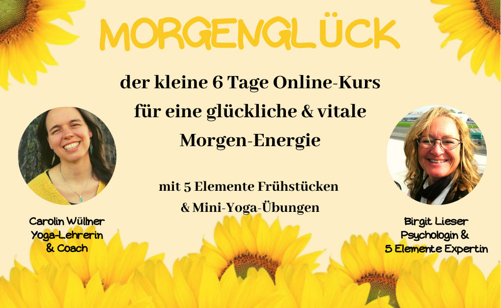 Genieße 6 Tage lang mit uns zusammen köstliche 5 Elemente Frühstücks-Ideen und wunderbare kleine Yoga-Übungen, um morgens glücklich durchzustarten.