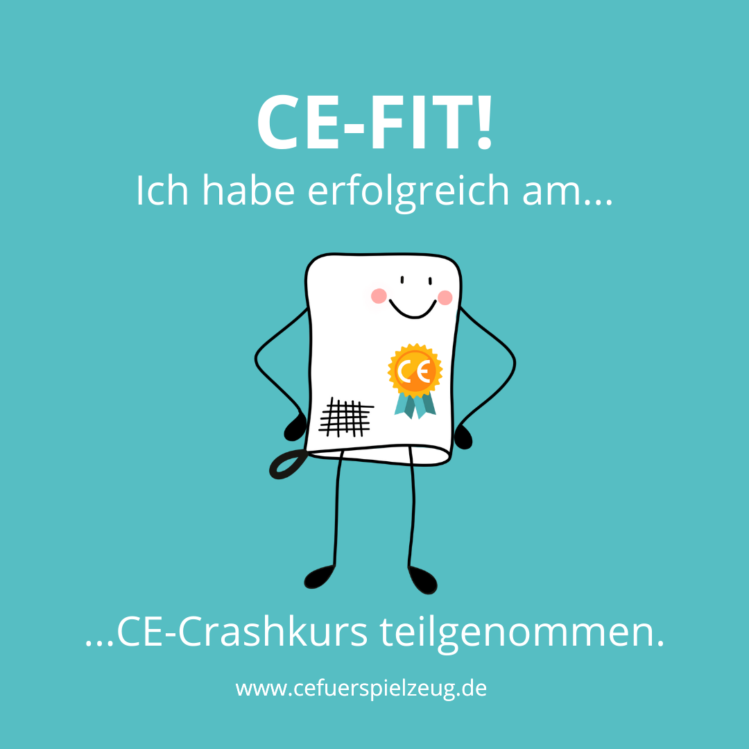 Herzlichen Glückwunsch! Du hast am Onlinekurs "CE-Crashkurs für Spielzeug" teilgenommen und alle Quiz bestanden. Lade dir gerne deine Teilnahmebestätigung herunter und poste die Grafik (kommt per E-Mail!) in deinen Social-Media-Kanälen. Ich freue mich über die Verlinkung @cefuerspielzeug! Gruß Nadja