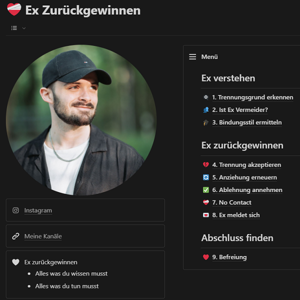 Fühlst du, dass zwischen dir und deinem Ex-Partner oder deiner Ex-Partnerin noch nicht alles gesagt ist? Möchtest du die Chance nutzen, eure Beziehung wieder aufleben zu lassen und die Liebe neu zu entfachen? In meinem "Ex Zurück"-Guide zeige ich dir genau, wie du das schaffen kannst.