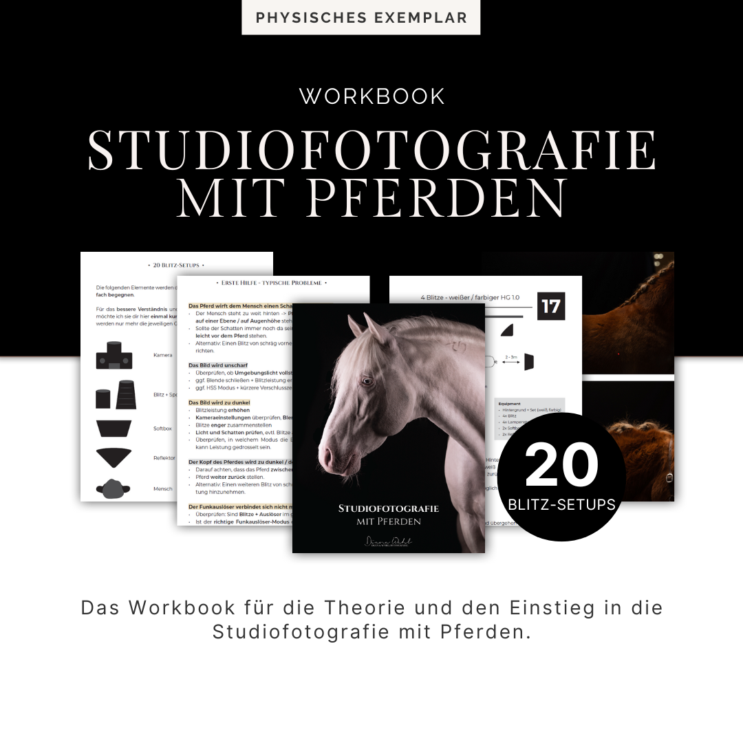 In diesem Workbook findest du den vollen Input zur Studiofotografie mit Pferden. Ich habe dir aus meinem Erfahrungsschatz dieses Nachschlagewerk für die Praxis erstellt, in dem du nicht nur allgemeine Informationen zu deinen Kameraeinstellungen findest, sondern auch Tipps und Tricks für verschiedene Pferde und Posings im Studio. Außerdem enthält das Workbook 20 Anleitungen für verschiedene Blitzsetups, um deine Studiofotografie noch besser und noch vielfältiger zu machen.