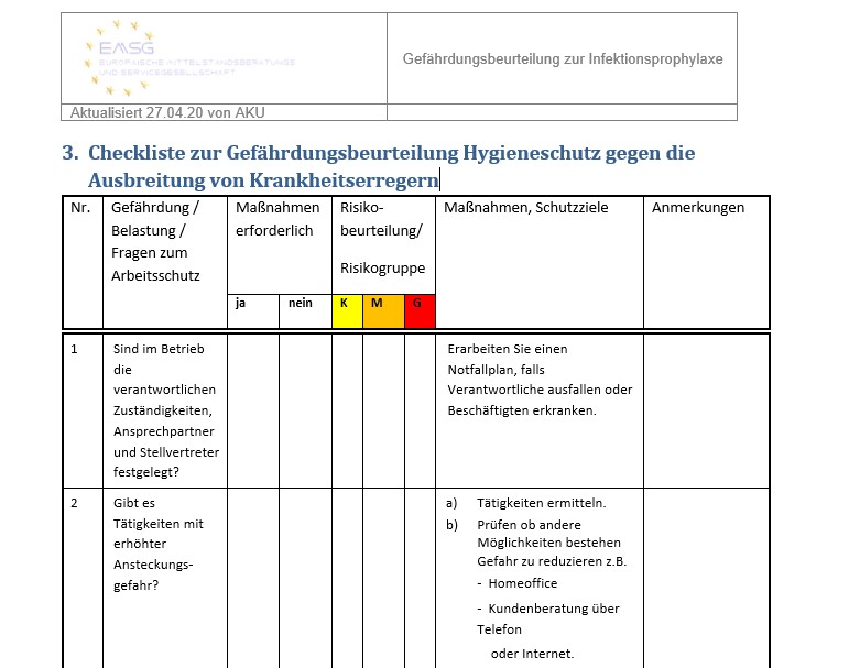 Der betrieblichen Gefährdungsbeurteilung kommt in Zeiten von Corona besondere Bedeutung zu. Dort wo der Betrieb nicht durch Regelungen der Bundesregierung, der Landesregierungen oder der Kommunalverwaltung untersagt oder eingeschränkt wurde, müssen die Unternehmen die spezifischen Gefährdungen am Arbeitsplatz ermitteln und geeignete Maßnahmen ergreifen, um Beschäftigte vor Ansteckung zu schützen und eine weitere Ausbreitung des Virus zu verhindern.