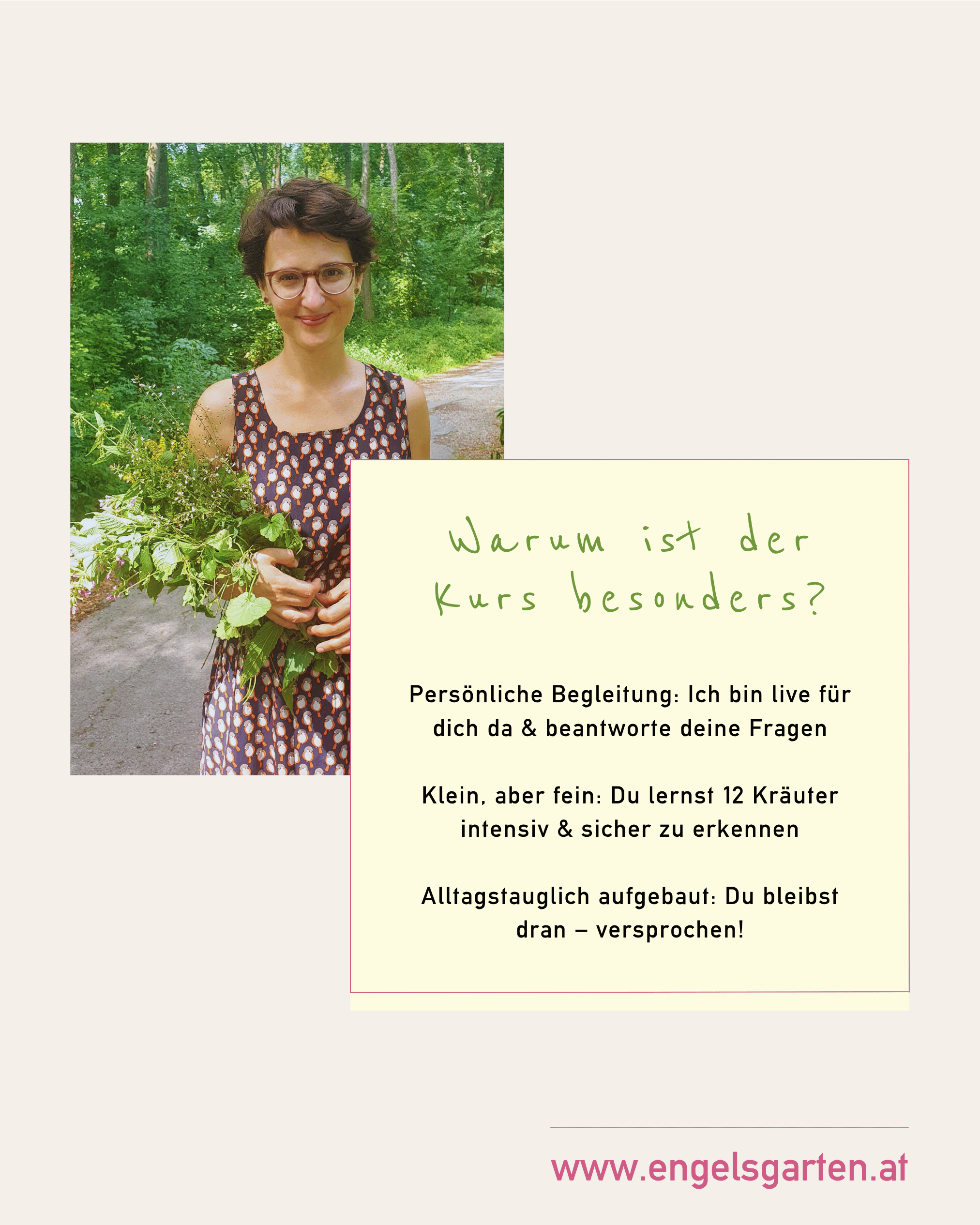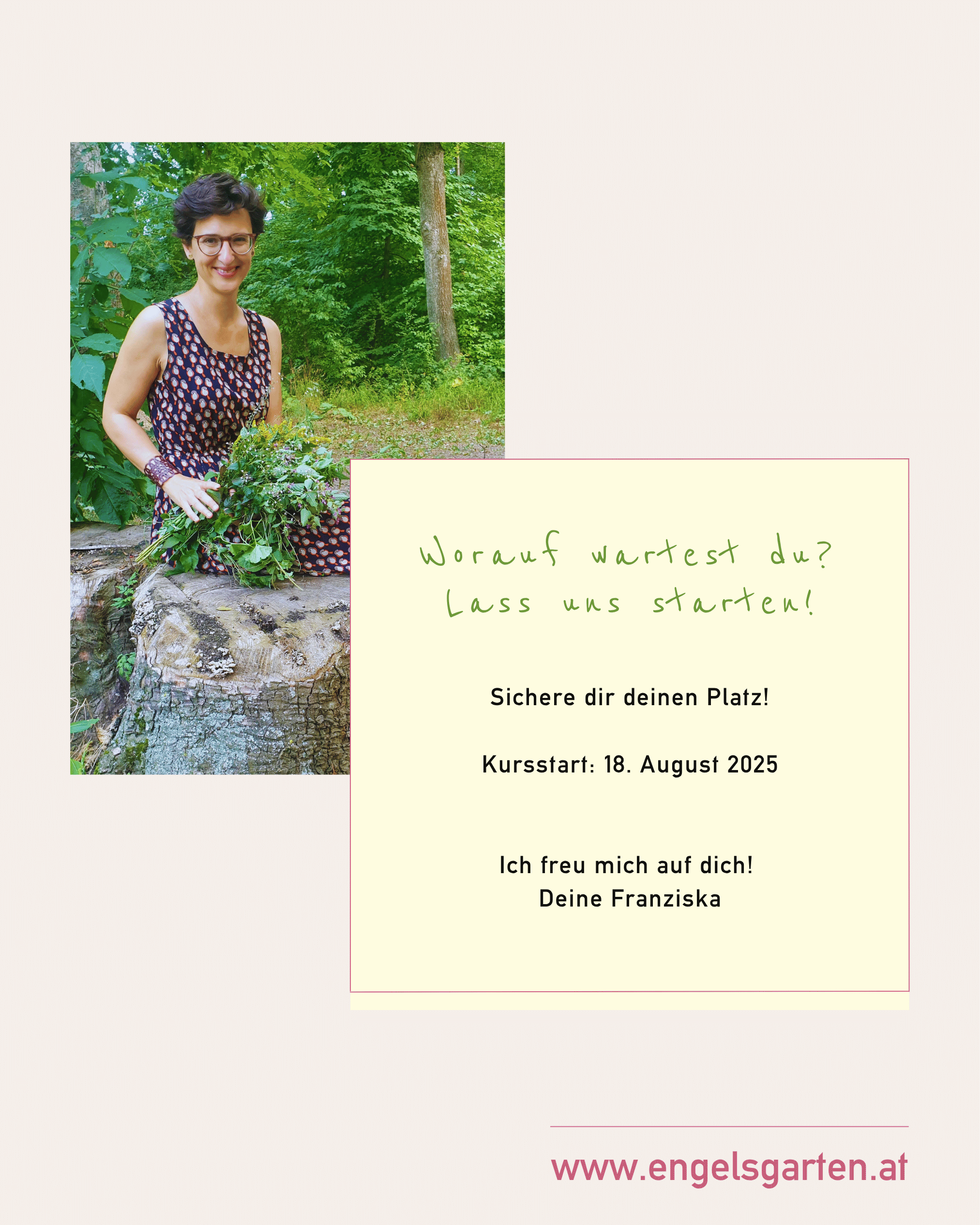 Nach diesem Kurs bist du in der Lage, die gelernten Kräuter sicher zu erkennen, zu sammeln und zu nutzen, ohne Angst vor Verwechslungen. Du gehst mit offenen Augen durch die Natur und entdeckst an jeder Ecke Wildkräuter, die du wirklich gut kennst. Die Freude ist riesig! Mit den Kräutern zauberst du köstliche Gerichte für dich und deine Familie. Du stellst kraftvolle Hausmittel gegen Alltagsbeschwerden für dich und dein Umfeld her. Du verbindest dich wieder mehr mit der Natur und daher auch mit dir.Ein Onlinekurs mit Franziska Polsterer