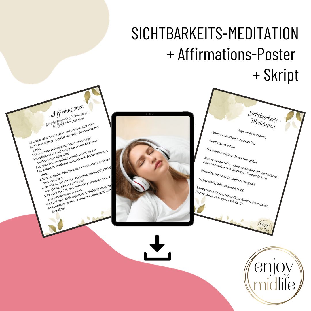 Dieses Paket enthält zur Vertiefung und zum Nachlesen ein Skript und ein Affirmationsposter, das du dir in Sichtweite hängen kannst, um die Wirksamkeit der Meditation noch zu verstärken.