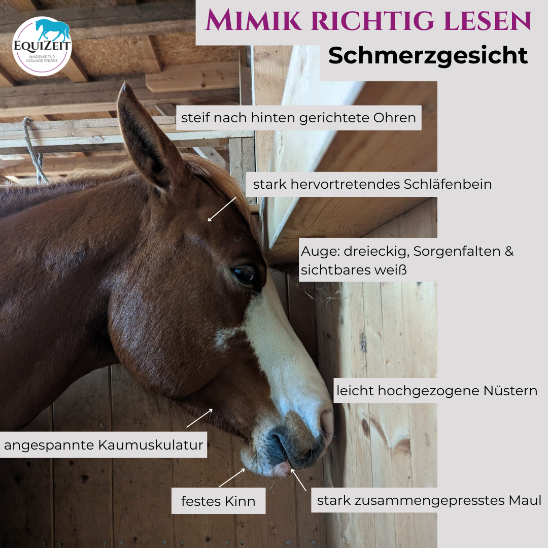 "Pferde leiden still". Diesen Satz haben die meisten schon einmal gehört und doch werden Schmerzen beim Pferd, und damit auch die dahinterstehende Erkrankung/Verletzung nicht oder erst spät erkannt. Hartnäckig halten sich veraltete Sichtweisen in Bezug auf Ausbildung und Erziehung von Pferden: man müsse sich stets durchsetzen, zeigen wer der Chef ist und halt einfach mal drüber reiten. Lerne wie du (auf wissenschaftlicher Grundlage) Schmerzen beim Pferd erkennen und auch einordnen/bewerten kannst mithilfe von umfangreichen Fachwissen und Blickschulungen.