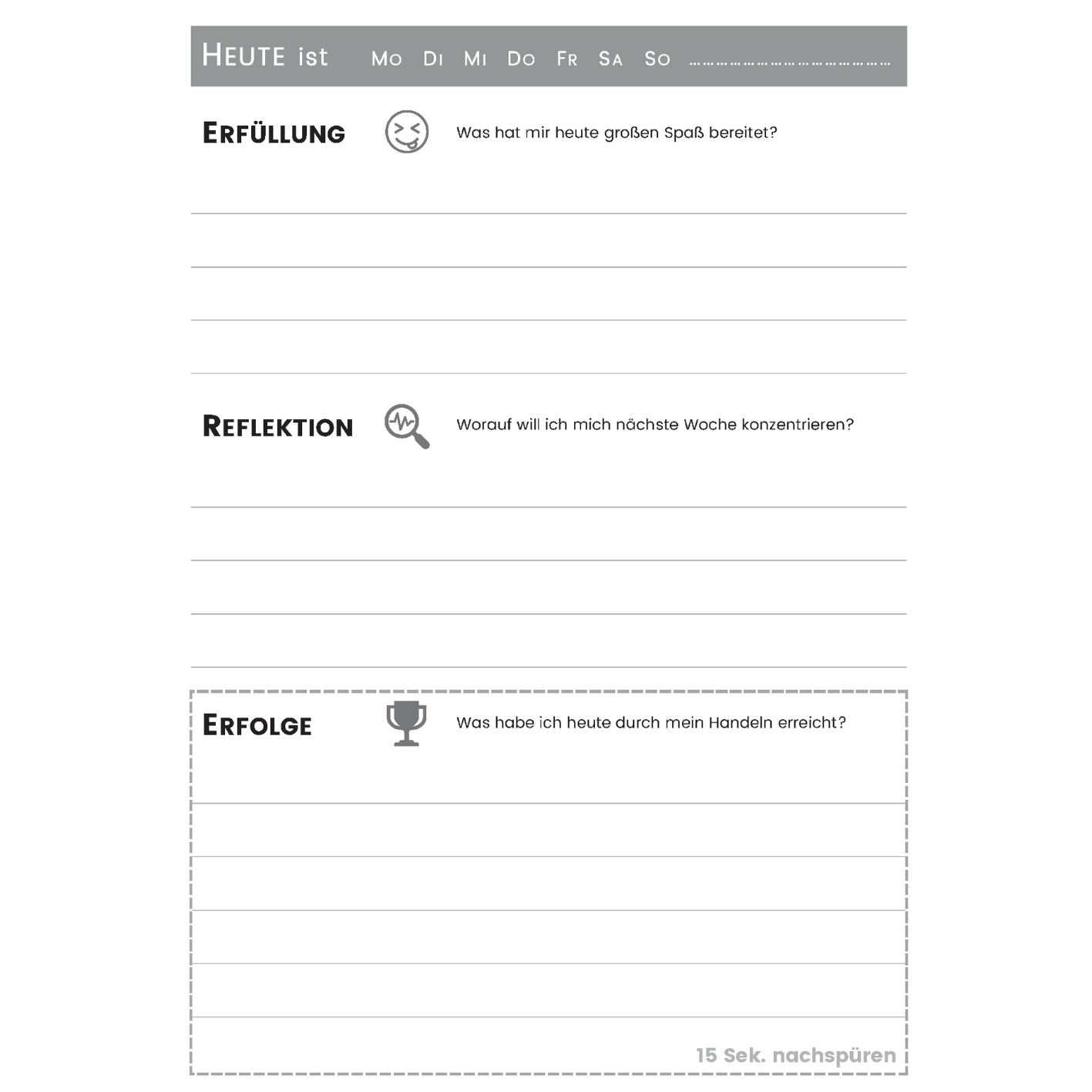 - 90 Tage Begleitung, 5 Minuten täglich – schnell im Alltag integriert. Notizseiten.