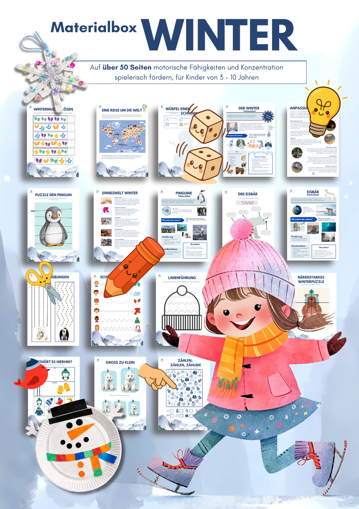 Tauche ein in die magische Welt des Winters mit unserer digitalen Materialbox WInter! Perfekt geeignet für Eltern und Fachkräfte wie Erzieher, bietet diese Box eine Vielzahl an kindgerechten, motivierenden Inhalten zum Ausdrucken. Entwickelt von erfahrenen Ergotherapeuten, fördert unsere Winterbox gezielt die emotionale Entwicklung und das Einfühlungsvermögen der Kinder.