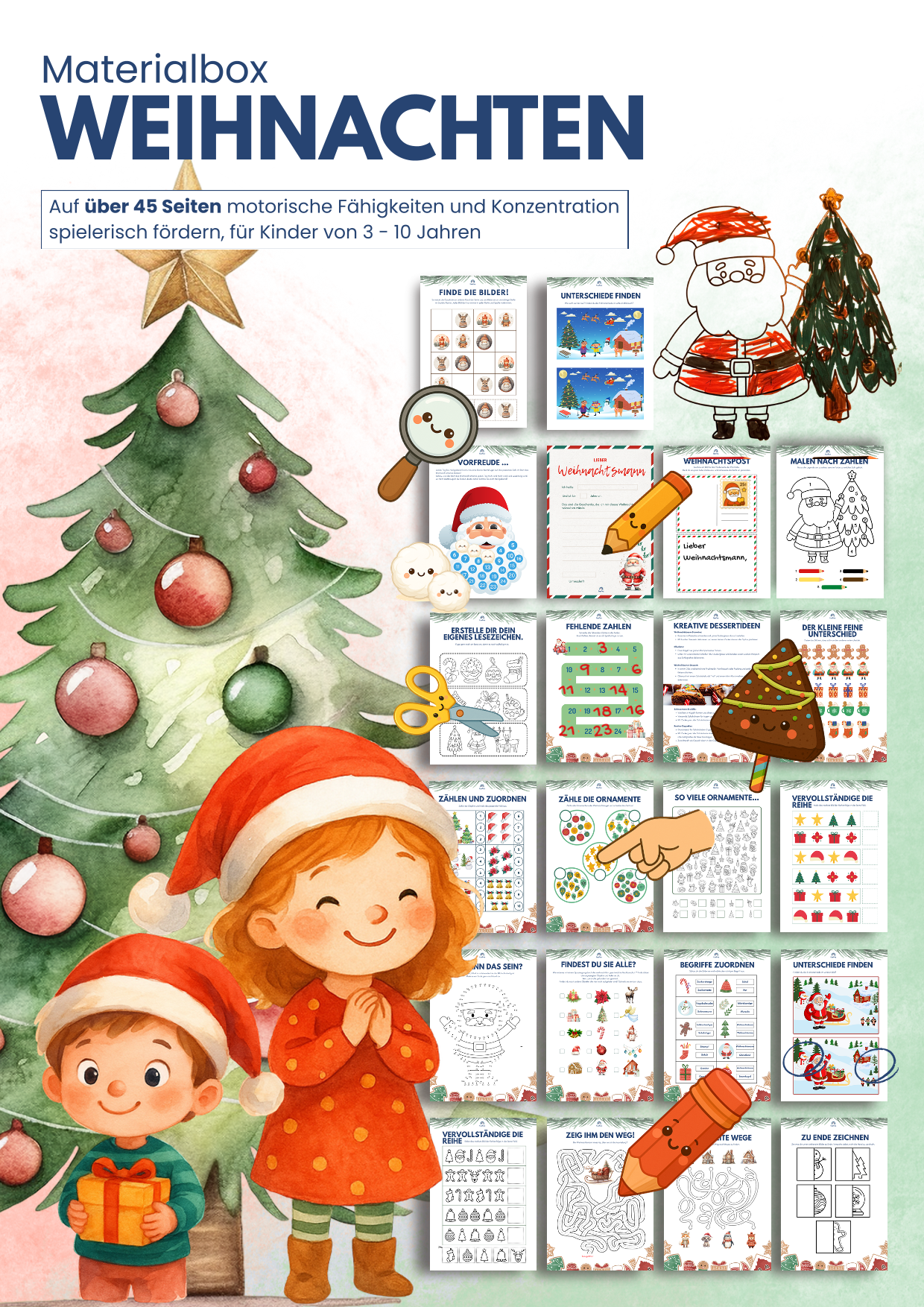 Verwandle die Weihnachtszeit in eine Lern- und Erlebnisreise für deine Kinder!Unsere Weihnachts-Materialbox bietet dir und den Kindern alles, was ihr für eine fördernde und unterhaltsame Weihnachtszeit benötigt. Bestelle jetzt und starte sofort mit den ersten Aktivitäten!