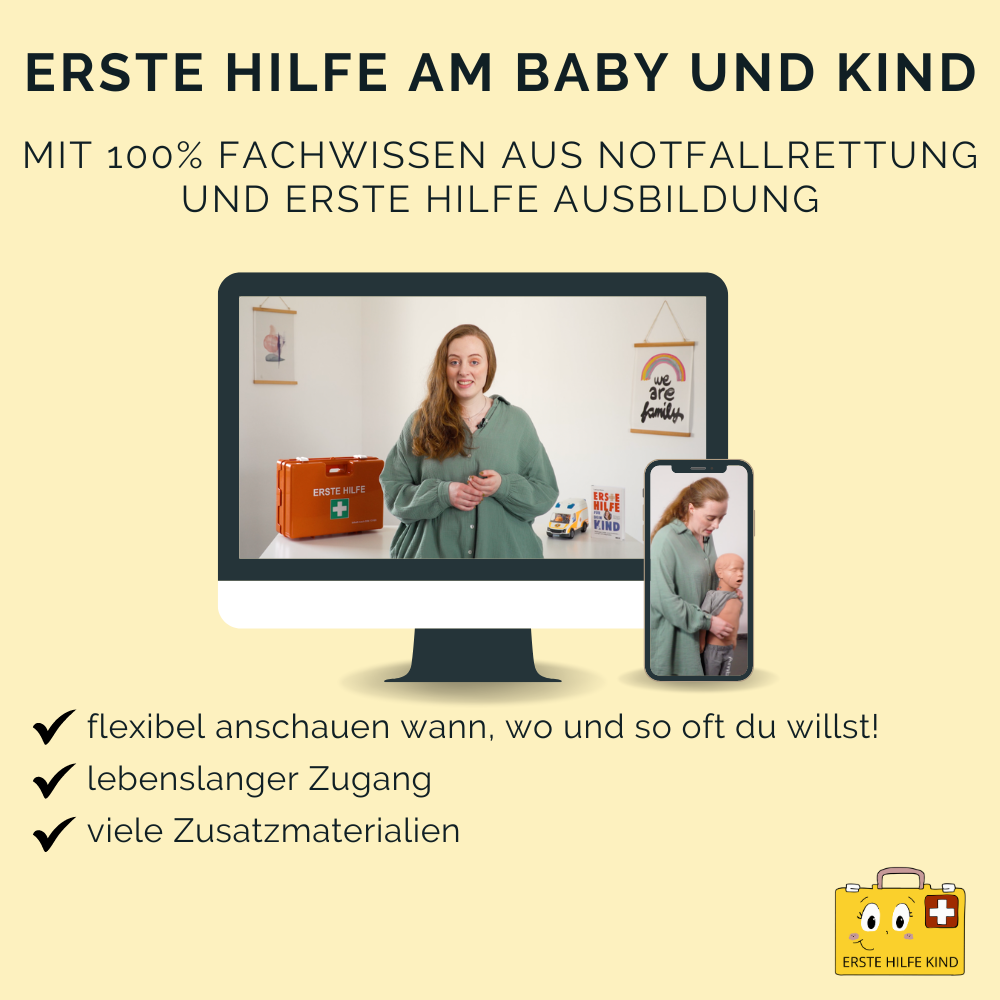 In meinem Erste Hilfe Kurs am Baby und Kind lernst du wie du deinem Kind im Notfall helfen kannst. Insbesondere die praktischen Maßnahmen zeige ich dir hier detailliert zum Nachmachen und Lernen! Durch das praktische Üben der Inhalte bleiben die Maßnahmen noch besser in deinem Kopf und sind im Notfall abrufbar!