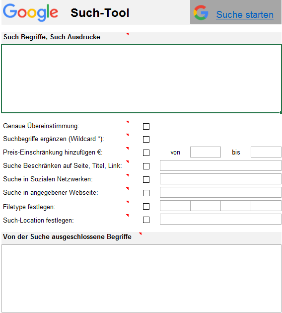 Nicht jeder User hat alle Google-Suchparameter immer im Hinterkopf und weiß um die korrekte Anwendung und Kombinationsmöglichkeiten Bescheid. Genau hier kommt das Such-Tool ins Spiel. Hier müssen einfach nur die Suchbegriffe eingetragen und die gewünschten Suchparameter per Klick angewählt werden und im Hintergrund wird der gewünschte Suchbegriff mit allen Parametern erzeugt und an Google übergeben. Das Ergebnis der Suche wird wie gewohnt in Ihrem Standard-Browser dargestellt.