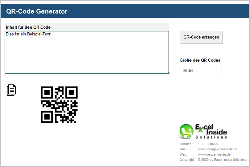 Beim Excel basierten QR Code Generator handelt es sich um ein Tool, mit dem beliebige Inhalte automatisiert mit nur einem Klick direkt in Excel erzeugt werden können. Mit dem Tool lassen sich QR-Codes für beliebige Inhalte wie beispielsweise Bestellnummern, Artikelnummern, Preise, Produktbeschreibungen und beliebige andere Informationen erzeugen.