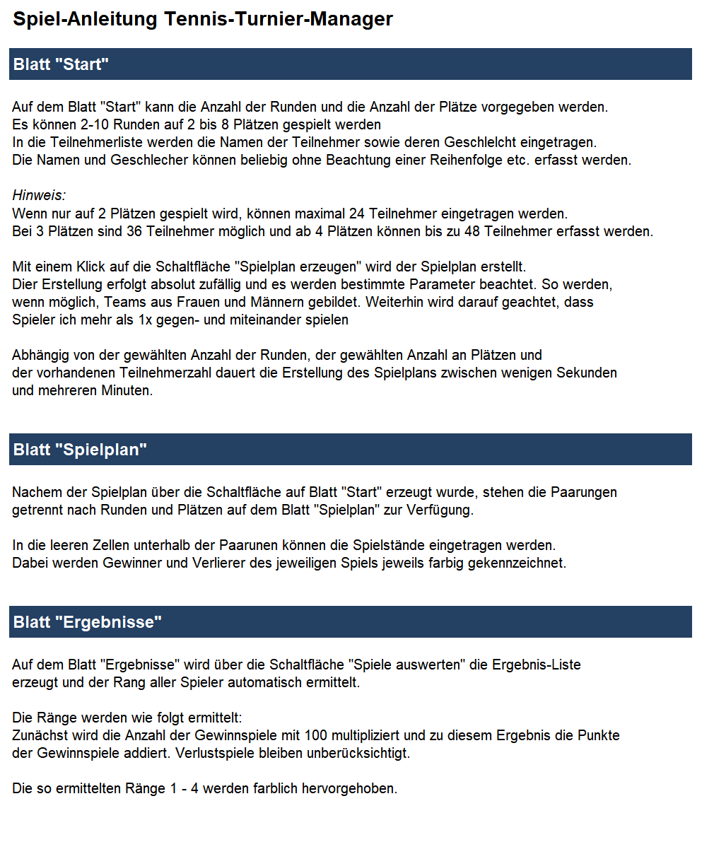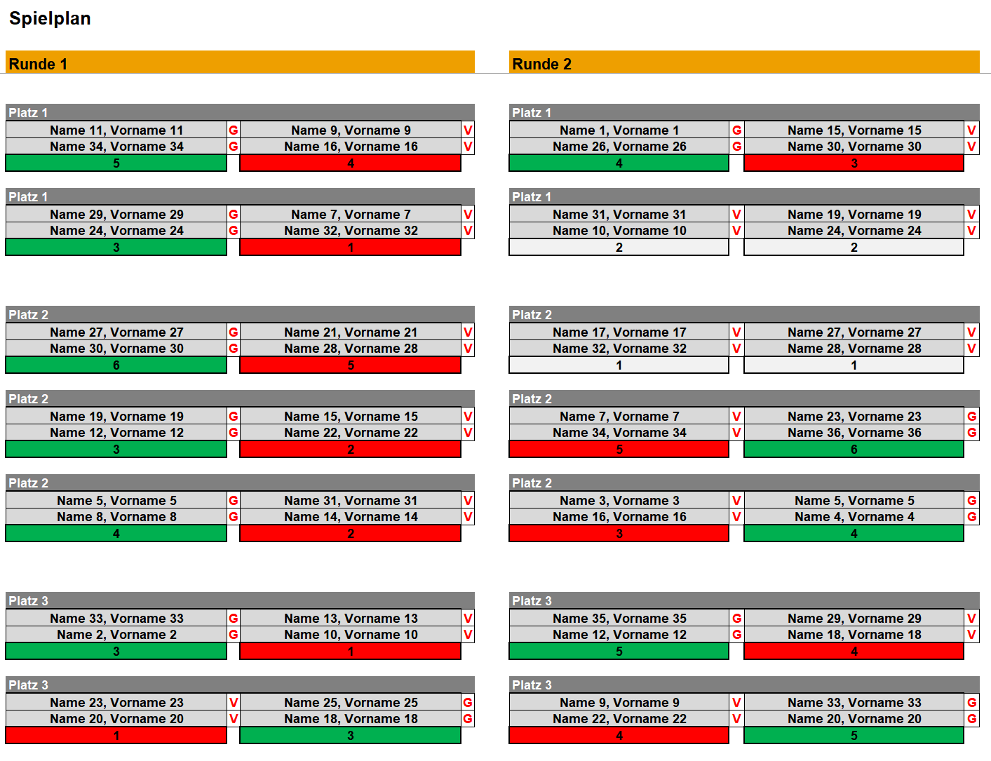 getrennt nach Runden und Plätzen auf dem Blatt "Spielplan" zur Verfügung.